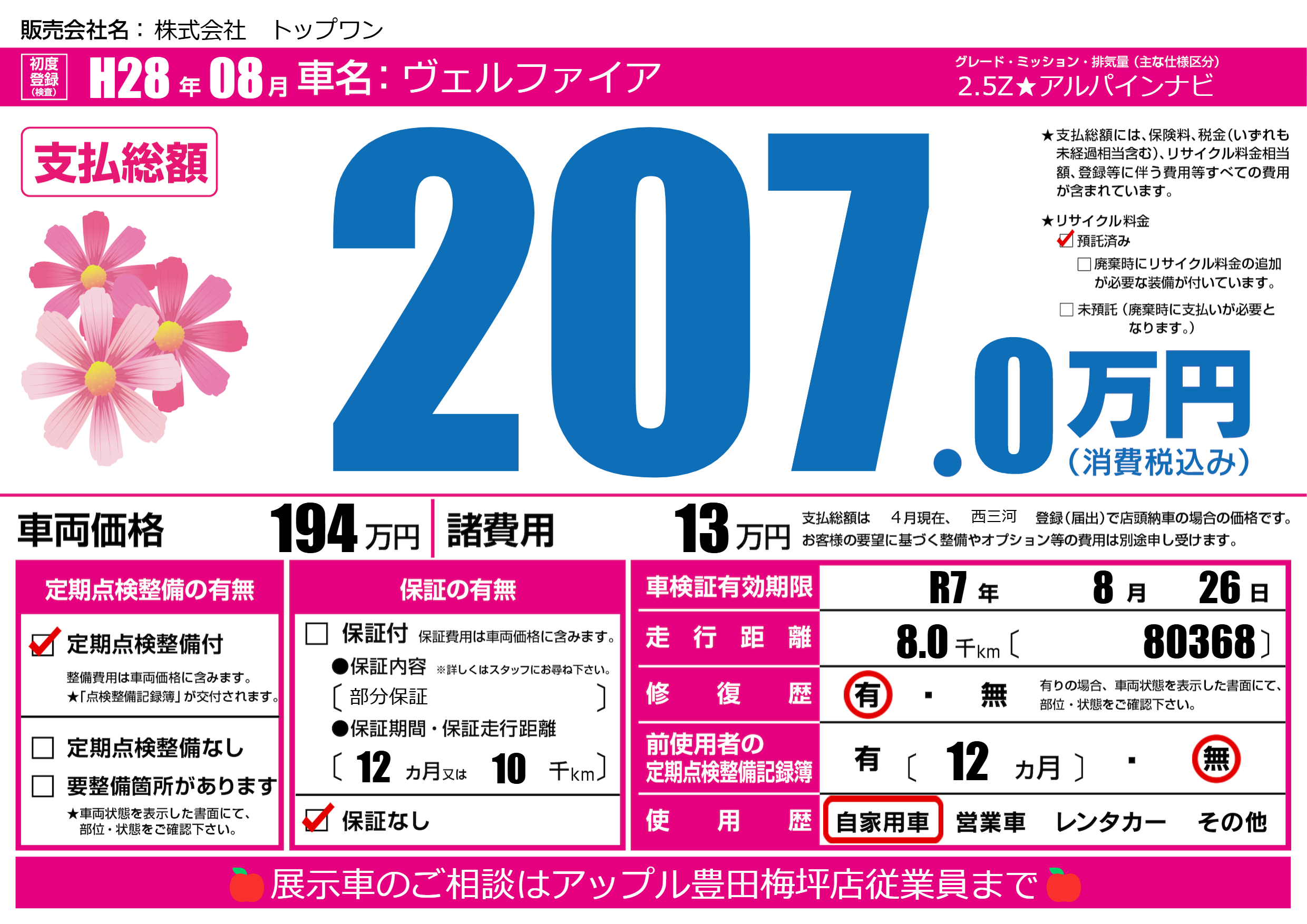 なし | 車検制限 | R7年8月26月 |