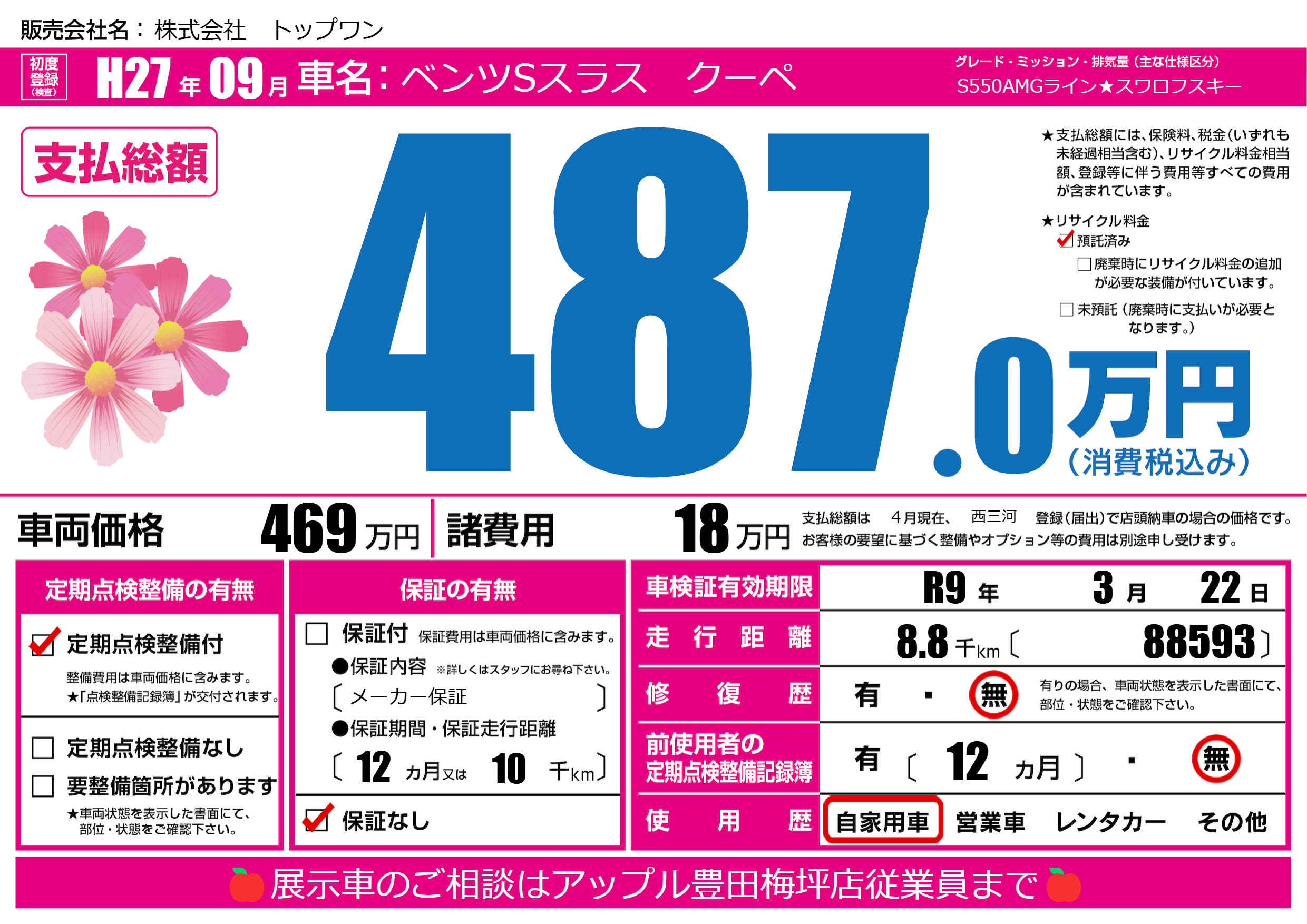 | 車名 | ベンツSスラス クーペ | グレード ミッション 排気量 |