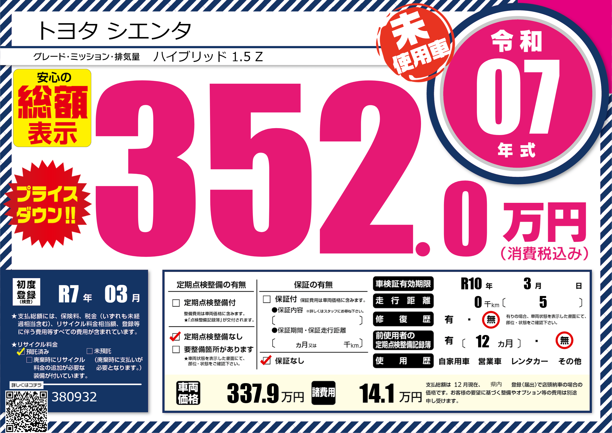 | 車名 | トヨタ シエンタ | グレード ミッション 排気量 |