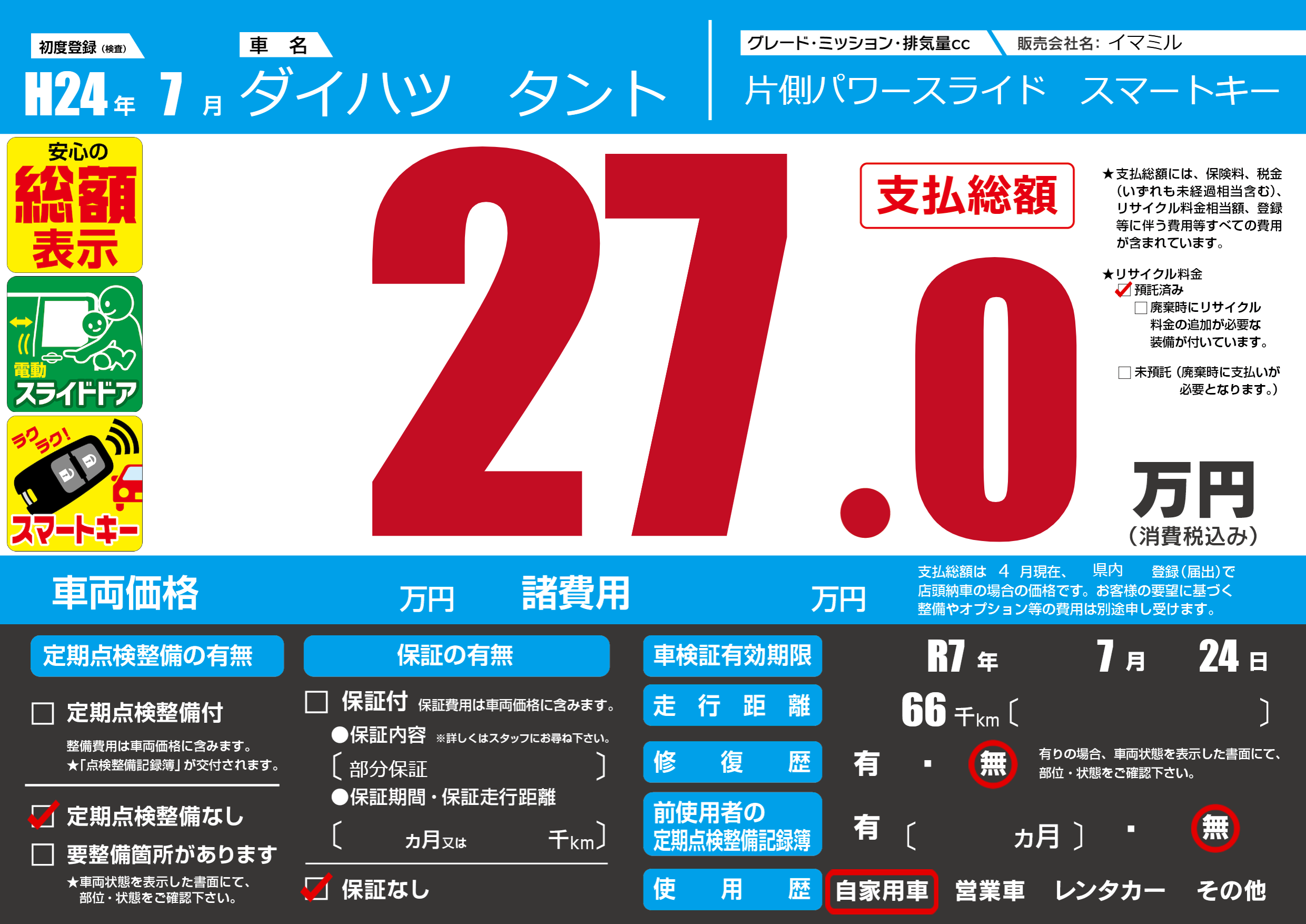 | 車名 | ダイハツ タント | グレード ミッション 排気量 |