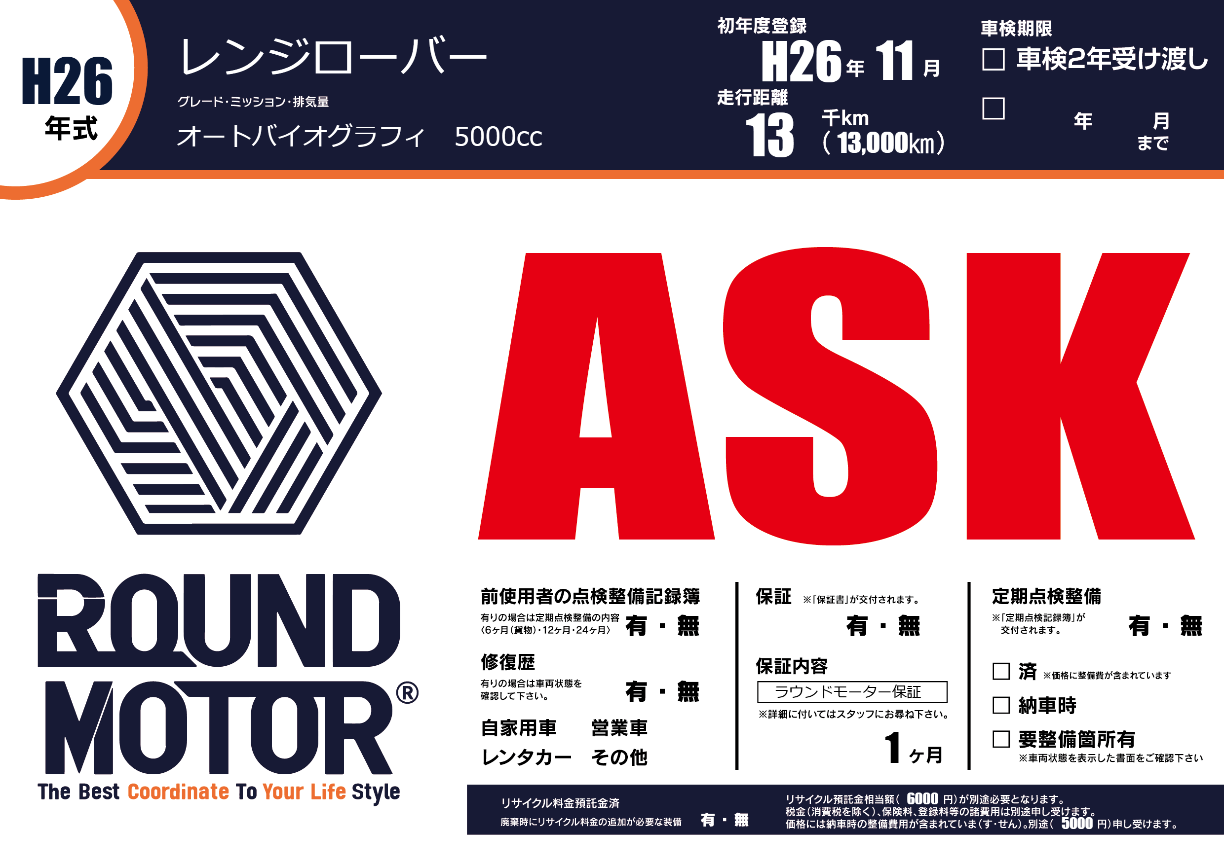 保証なし 保証内容(ラウンドモーター保証) 1ヶ月または()千kmまで |