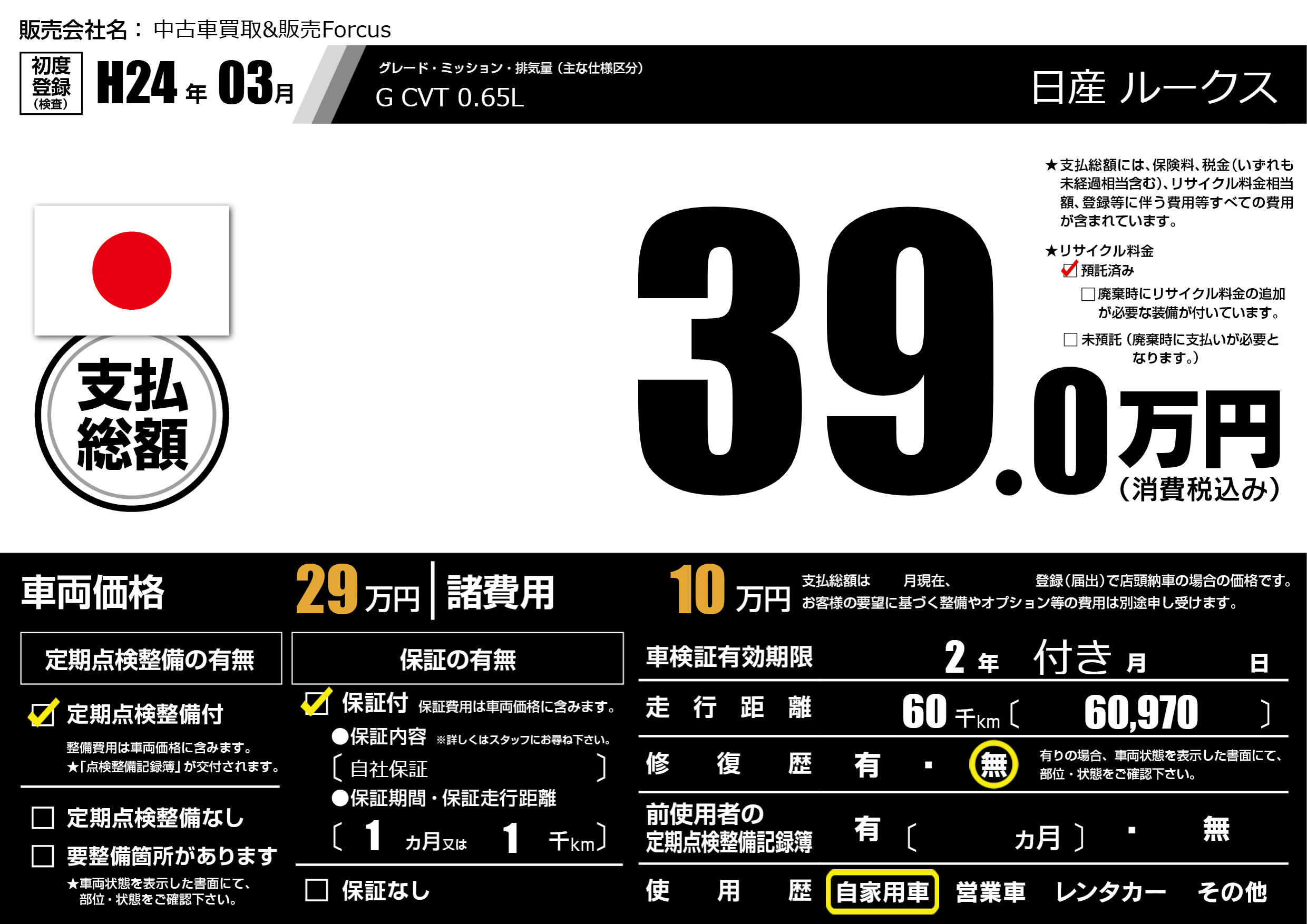| 走行キロ | 6万km | 初年度登録 | H24年03月 |
