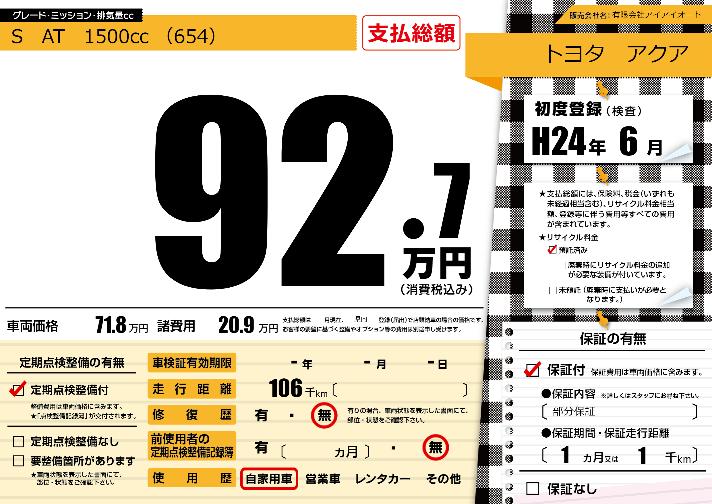 | 走行キロ | 10.6万km | 初年度登録 | H24年6月 |