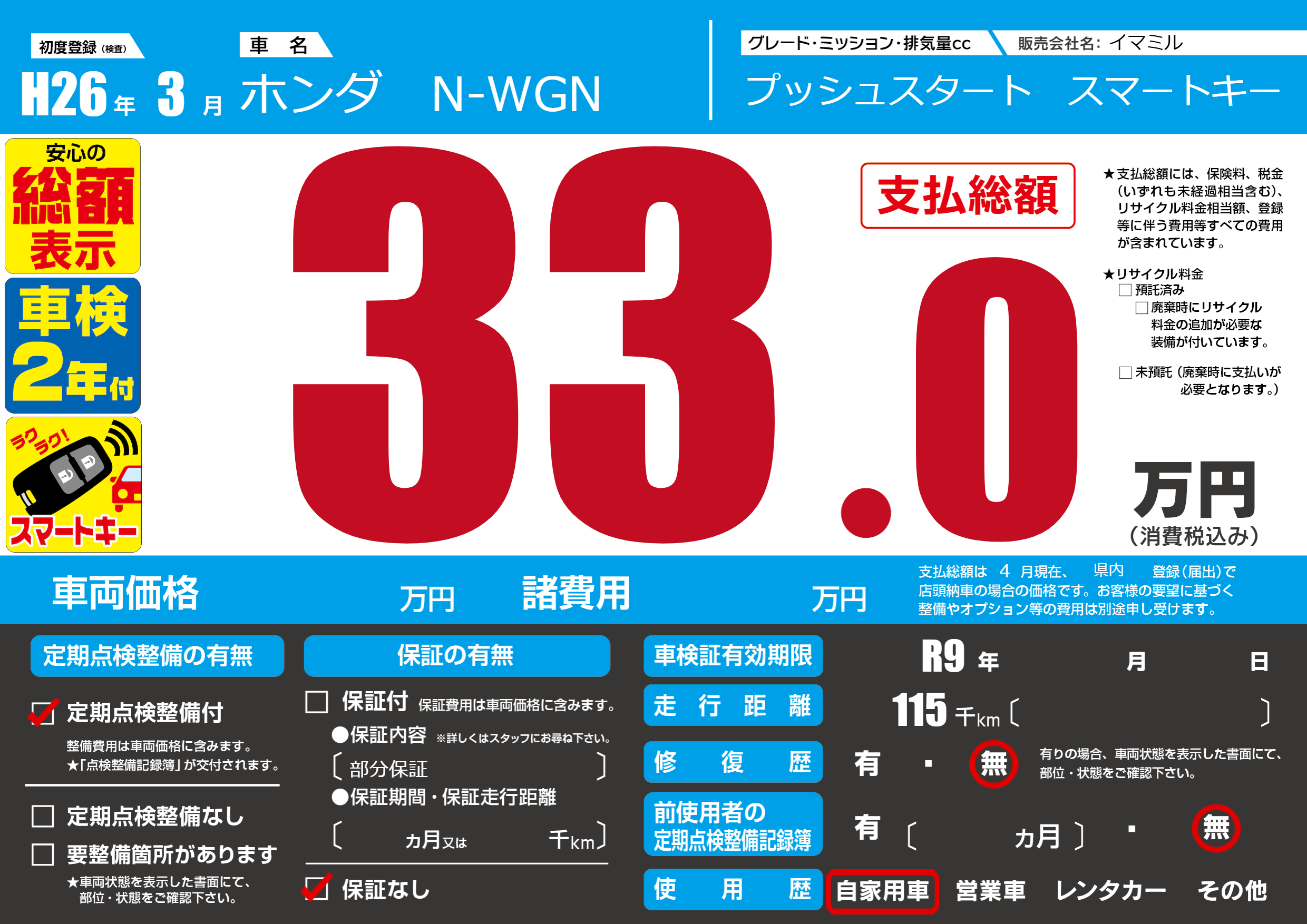 | 車名 | ホンダ N-WGN | グレード ミッション 排気量 |