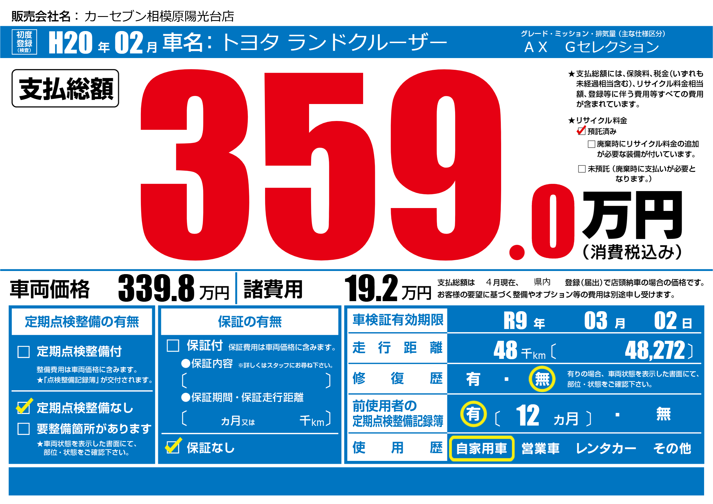 | 車検制限 | R9年 03月 02日 | ||