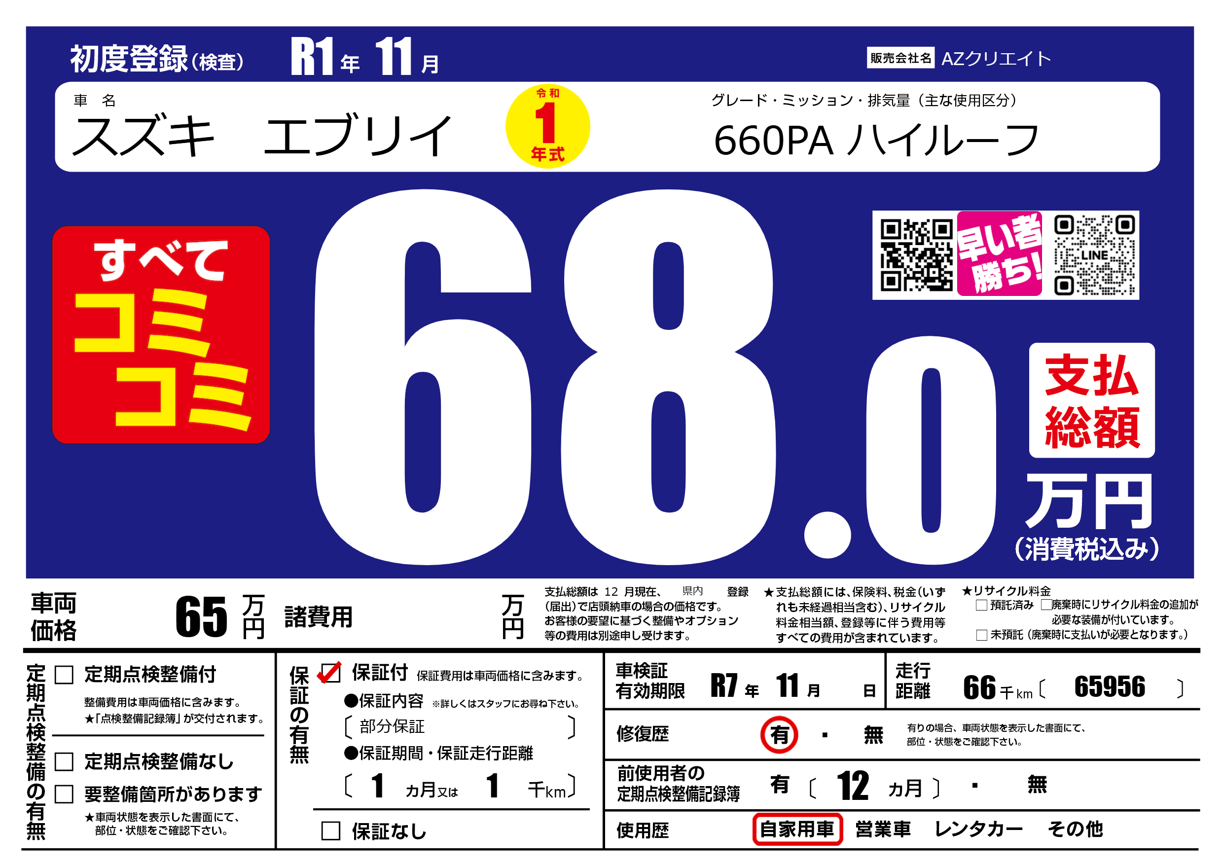 | 走行キロ | 6.6万km | 初年度登録 | R1年11月 |