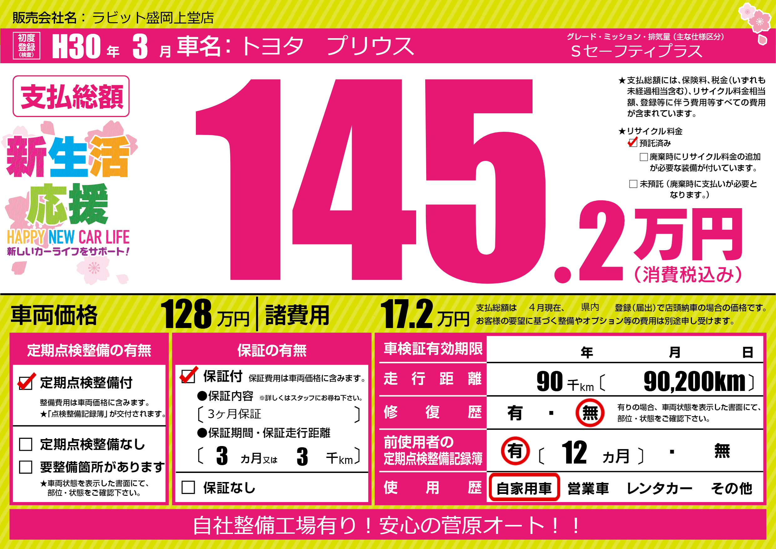 | 走行キロ | 9万km | 初年度登録 | H30年3月 |