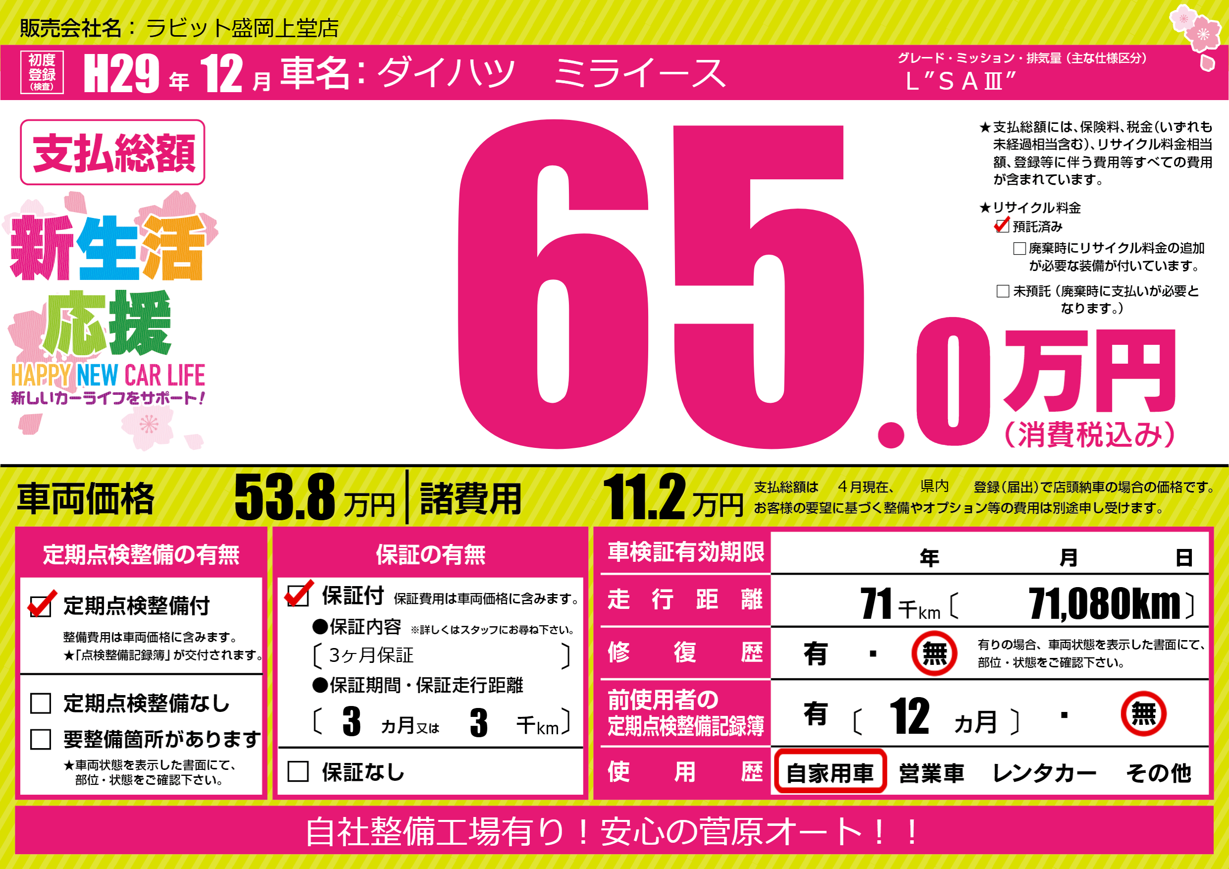 | 車名 | ダイハツ ミライース | グレード ミッション 排気量 |