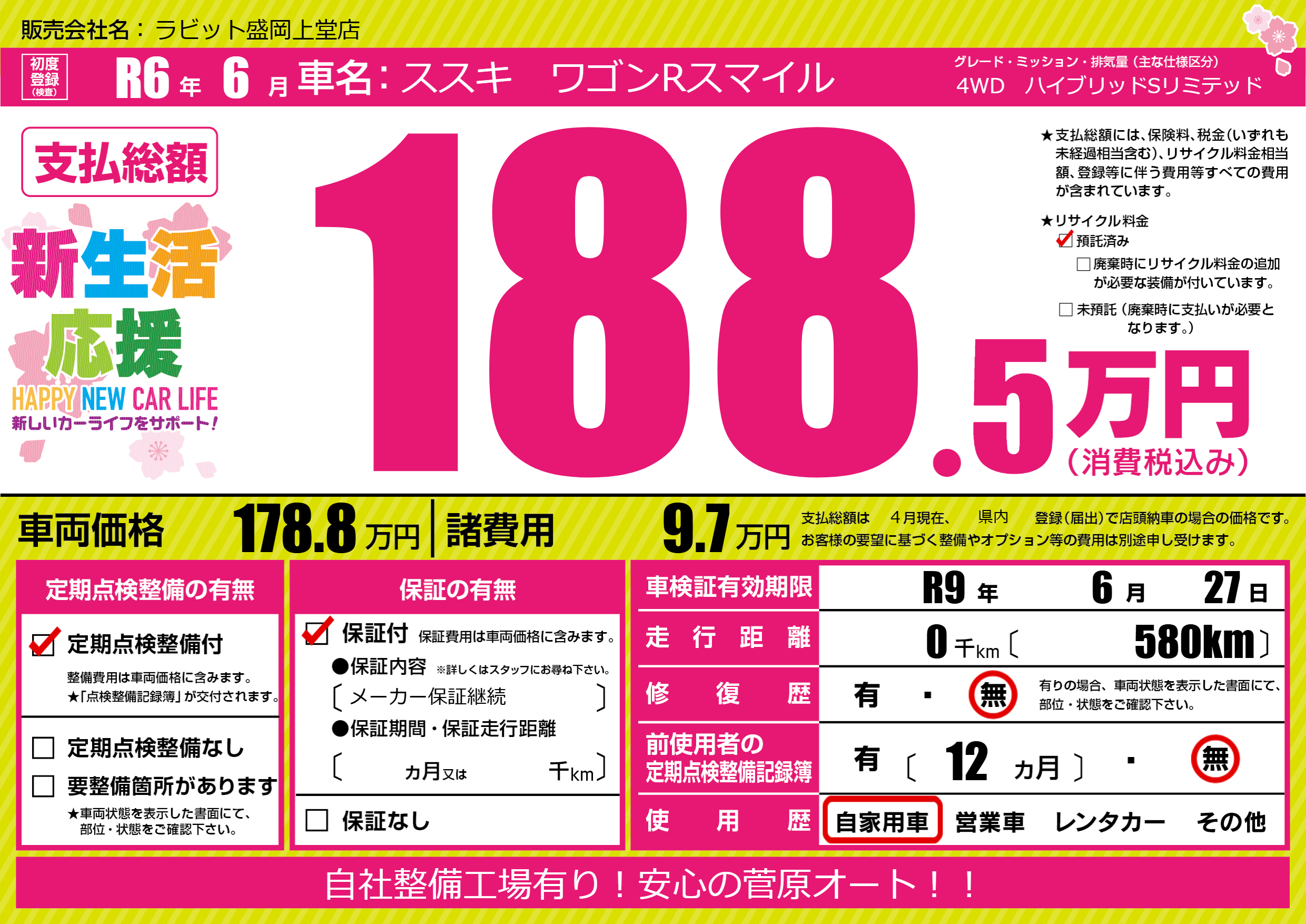 | 車名 | ススキ ワゴンRスマイル | グレード ミッション 排気量 |