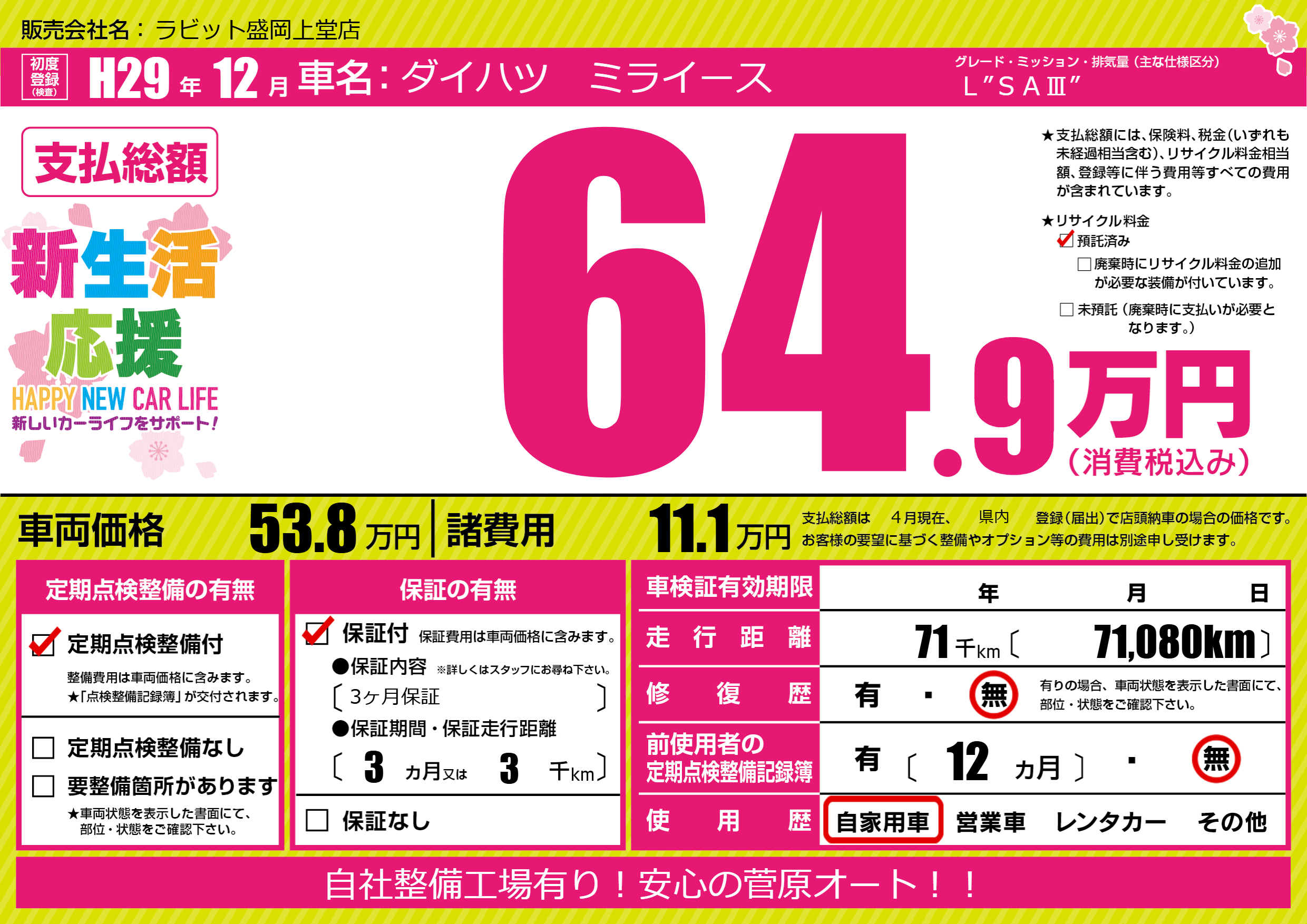 | 車名 | ダイハツ ミライース | グレード ミッション 排気量 |