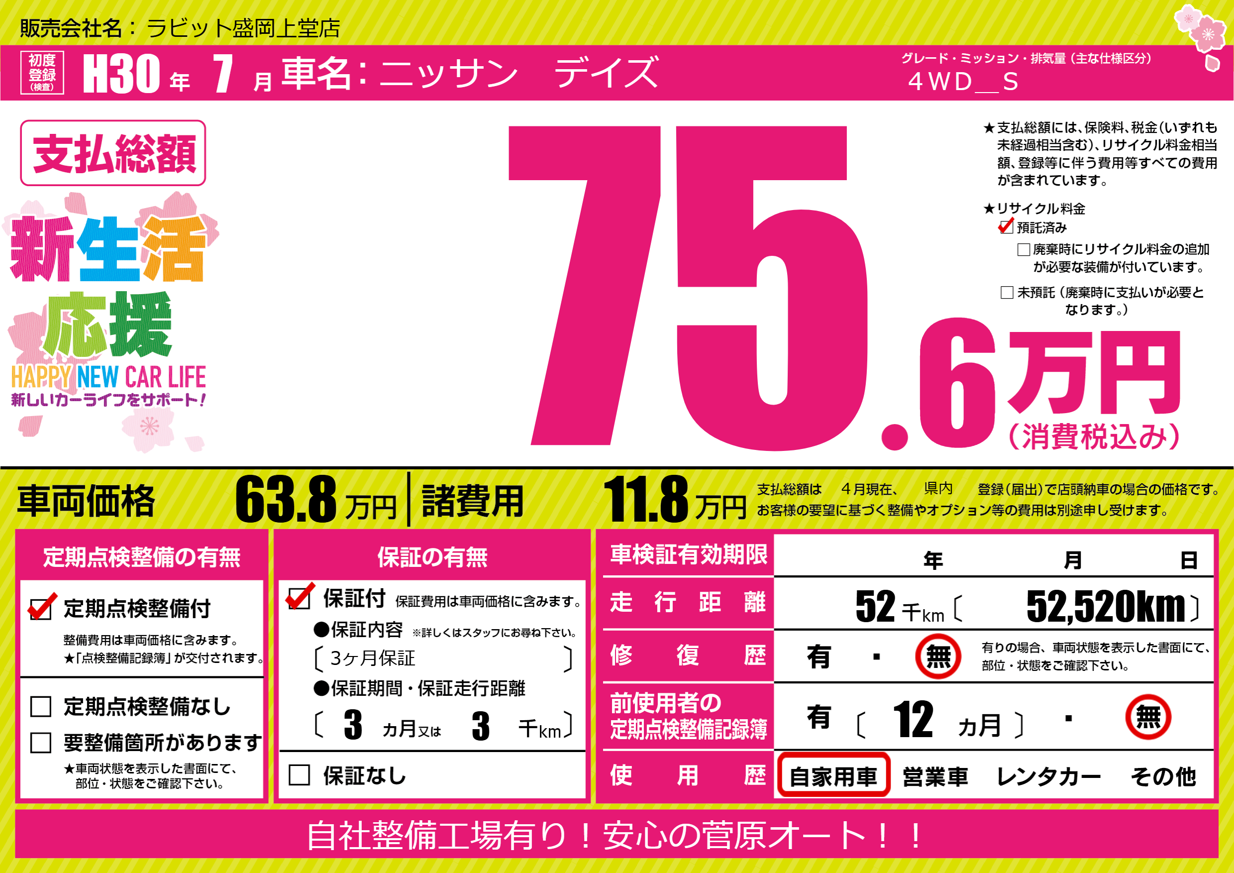 | 車名 | ニッサン デイズ | グレード ミッション 排気量 |