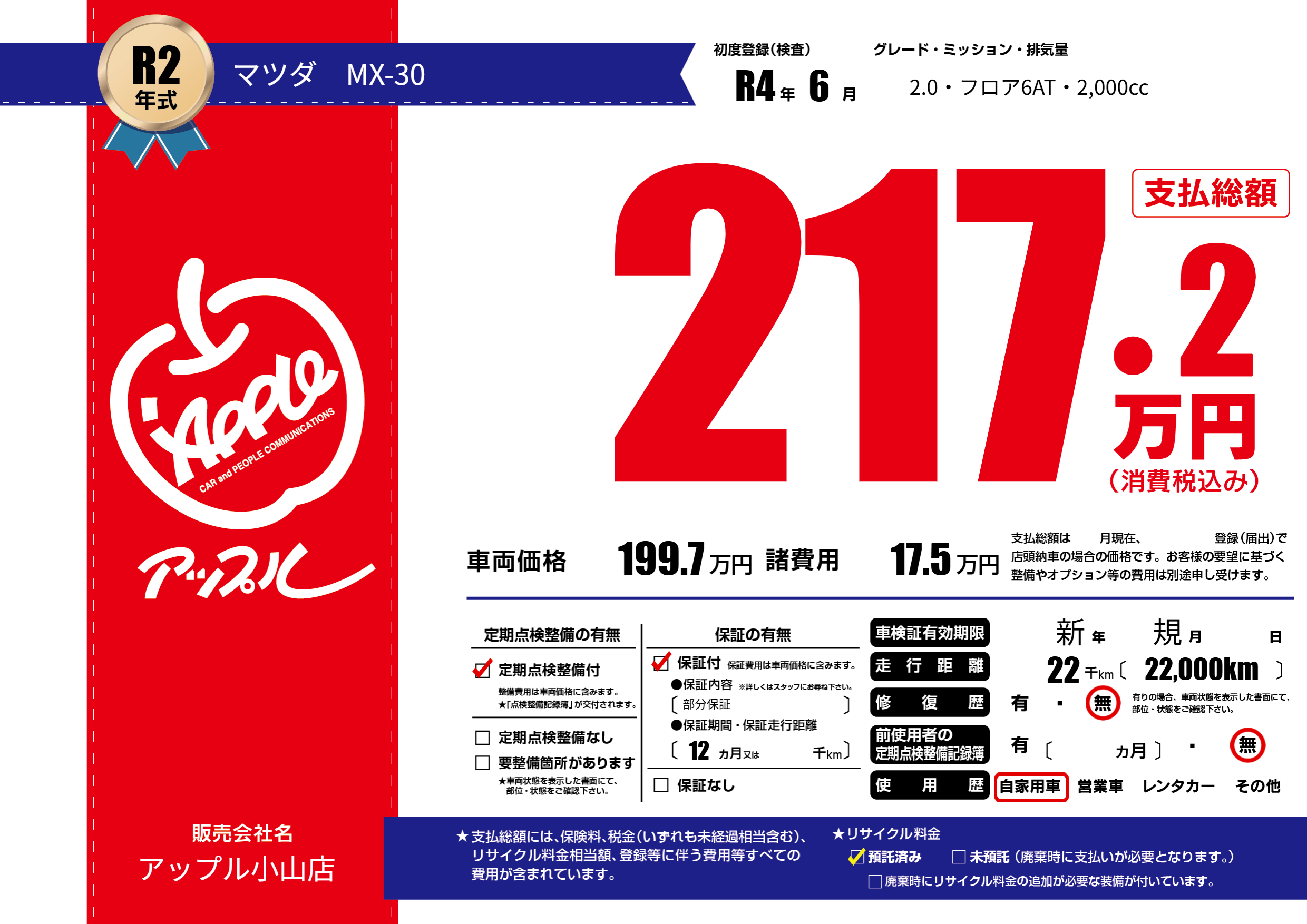 | 車名 | マツダ MX-30 | グレード ミッション 排気量 |
