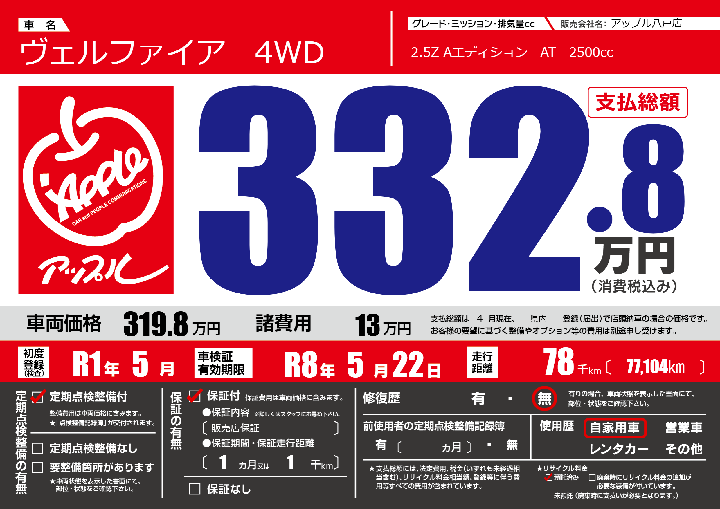| 車名 | ヴェルファイア 4WD | グレード ミッション 排気量 |