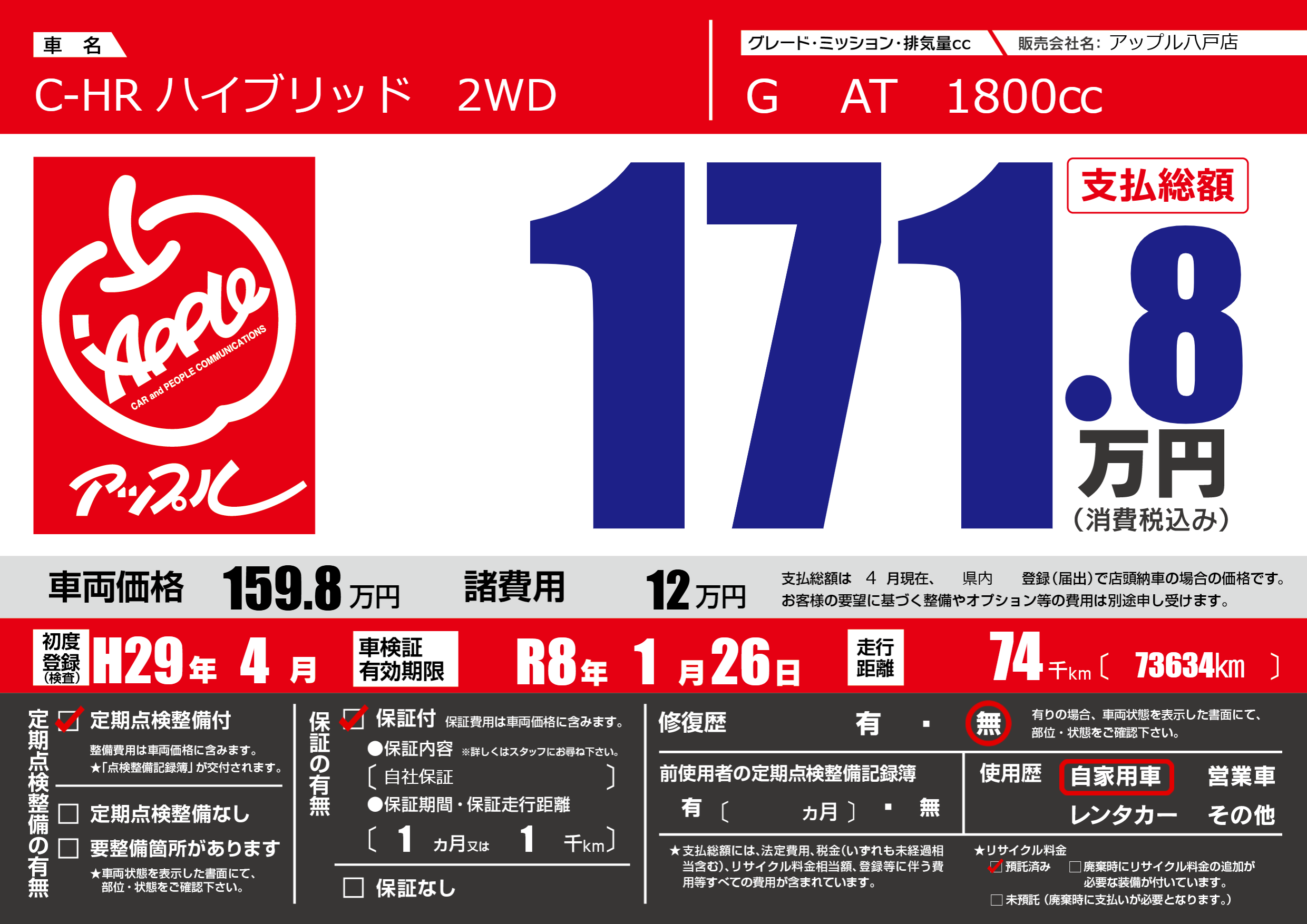 | 車名 | C-HR ハイブリッド 2WD | グレード ミッション 排気量 |