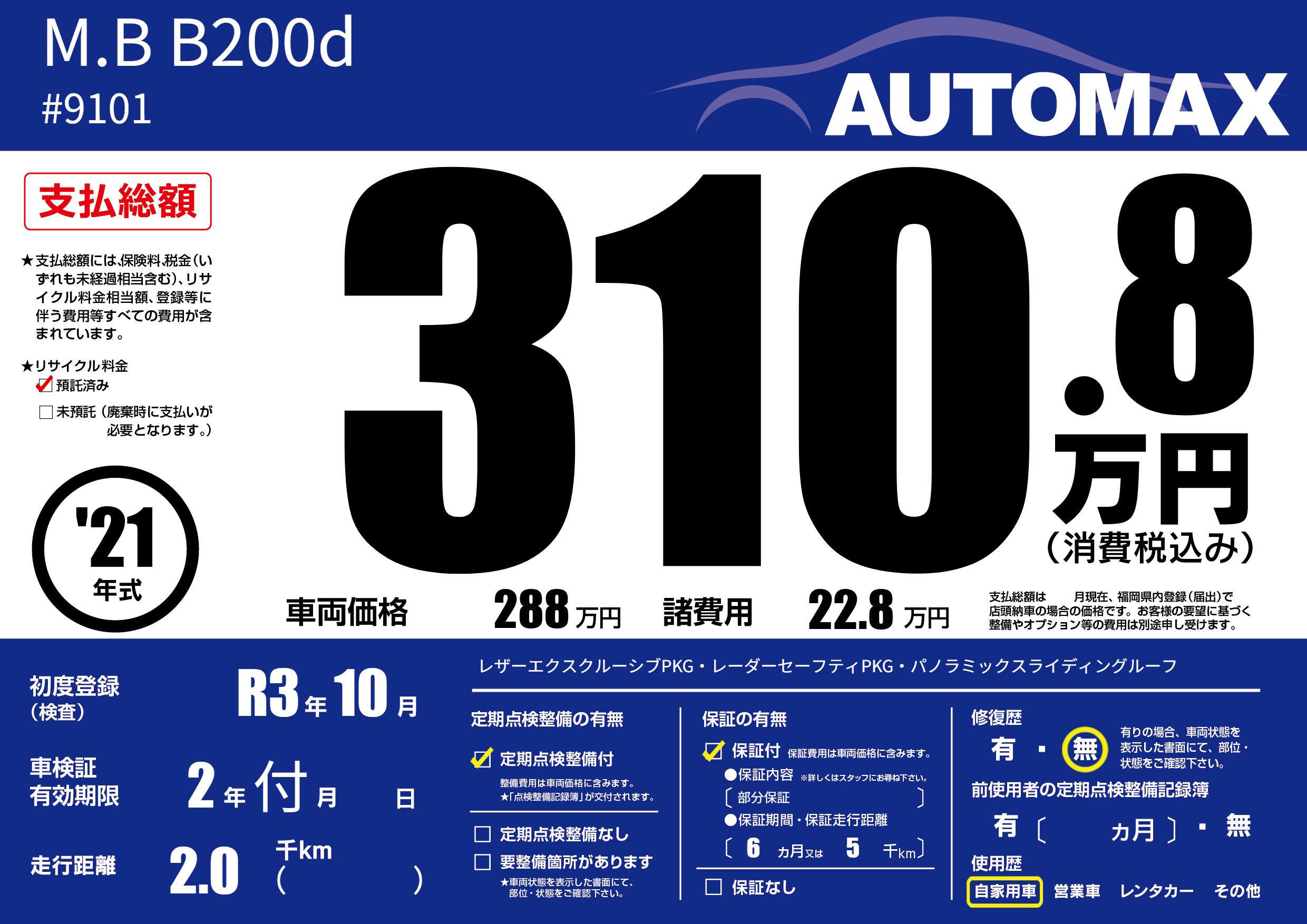 | 車名 | M.B B200d | グレード ミッション 排気量 |