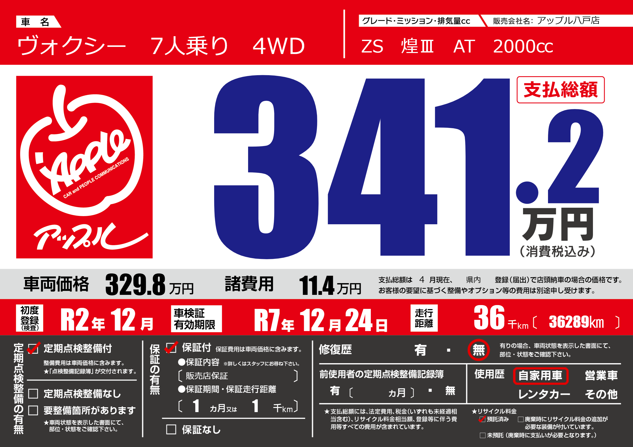 | 車名 | ヴォクシー 7人乗り 4WD | グレード ミッション 排気量 |