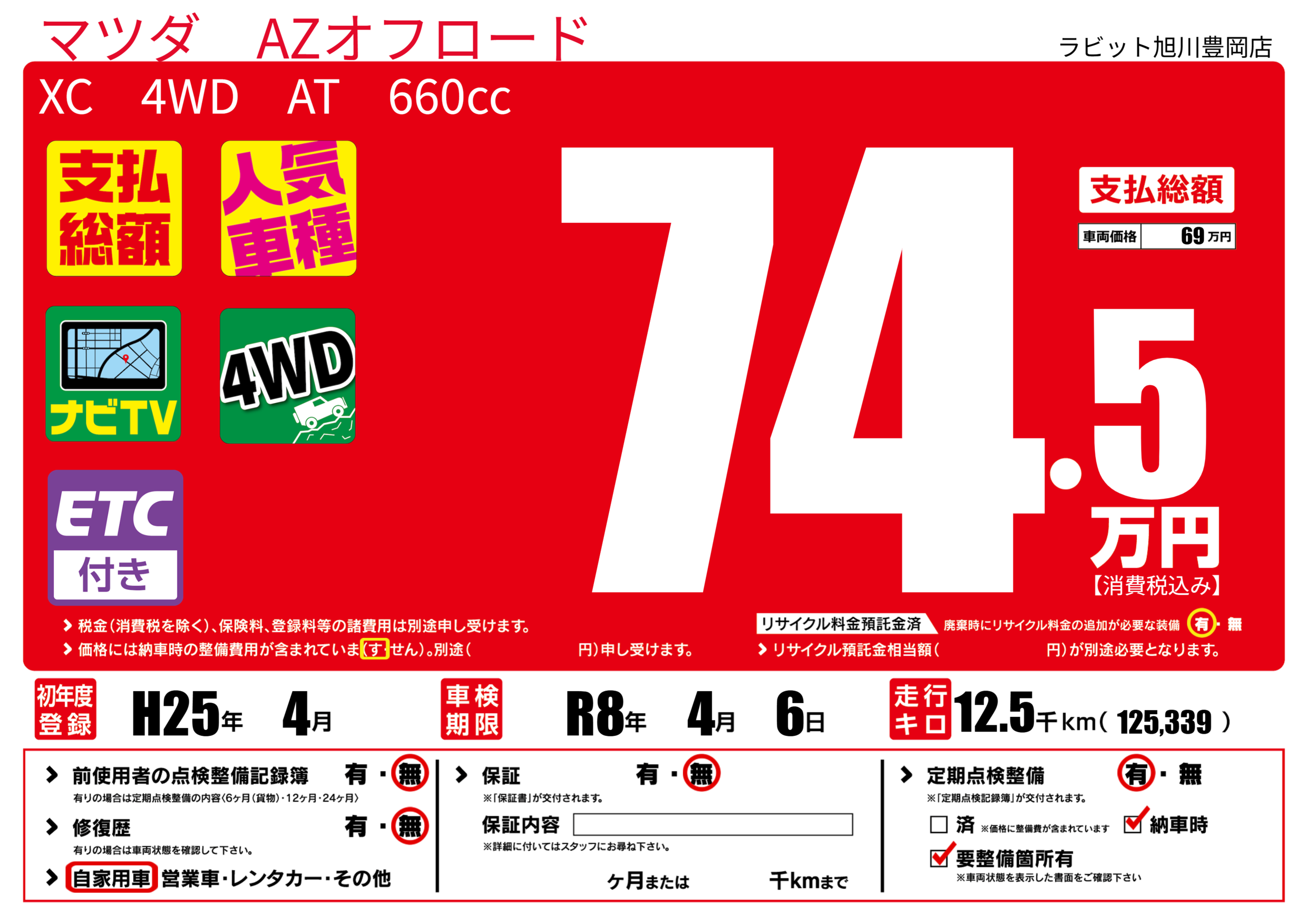 | 走行キロ | 1.2万km | 初年度登録 | H25年4月 |