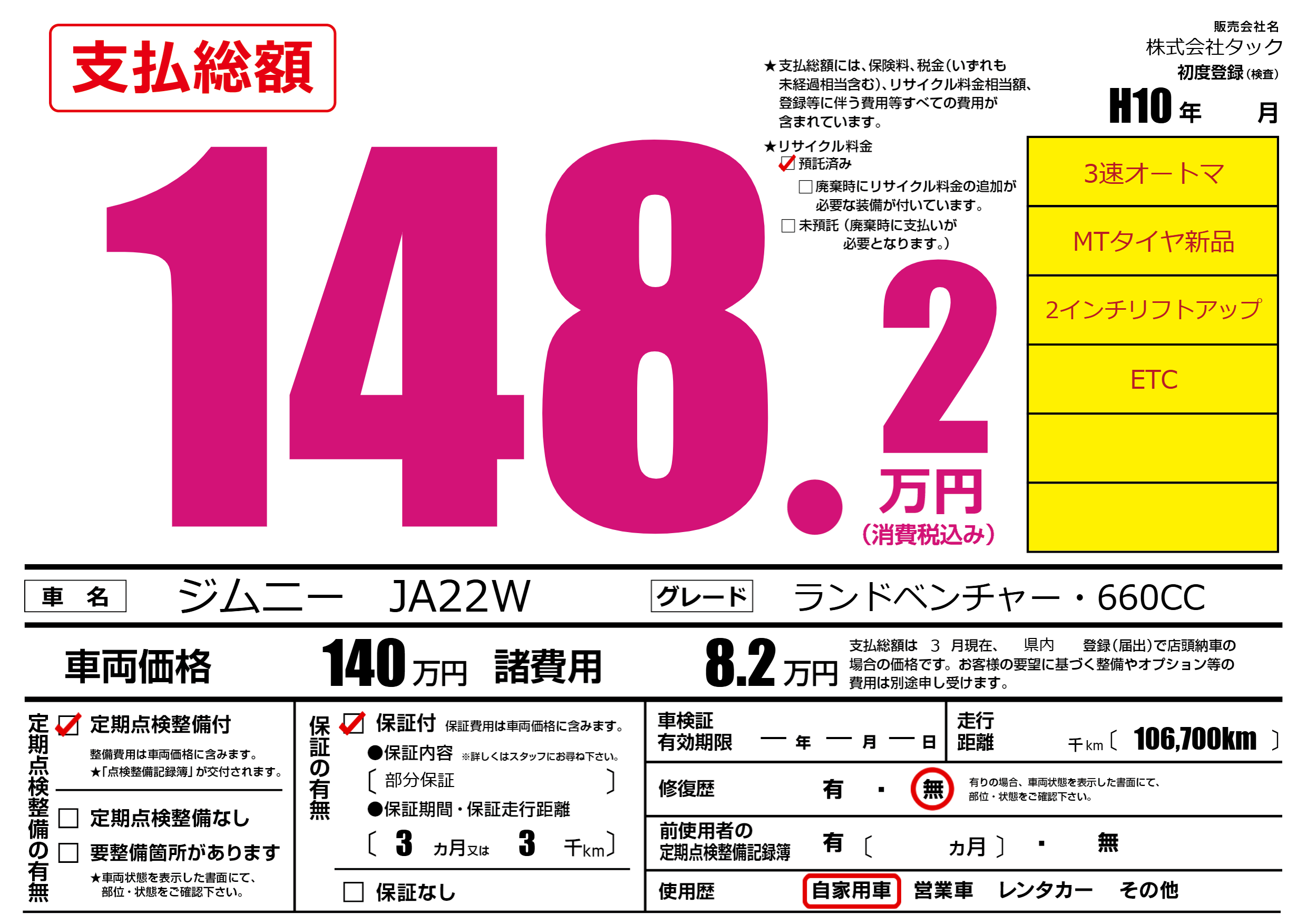 | 車名 | ジムニー JA22W | グレード ミッション 排気量 |