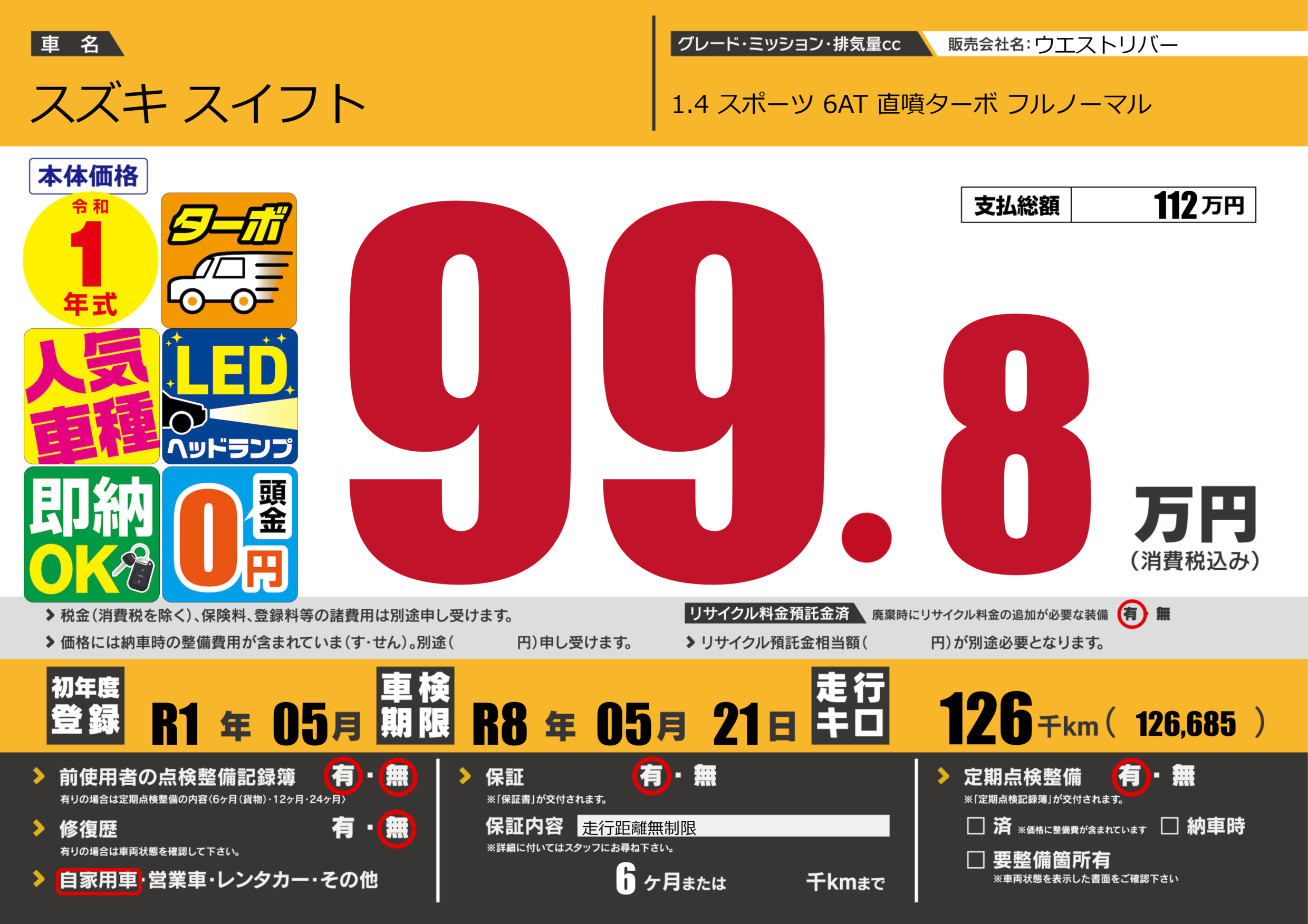 | 車名 | スズキ スイフト | グレード ミッション 排気量 |