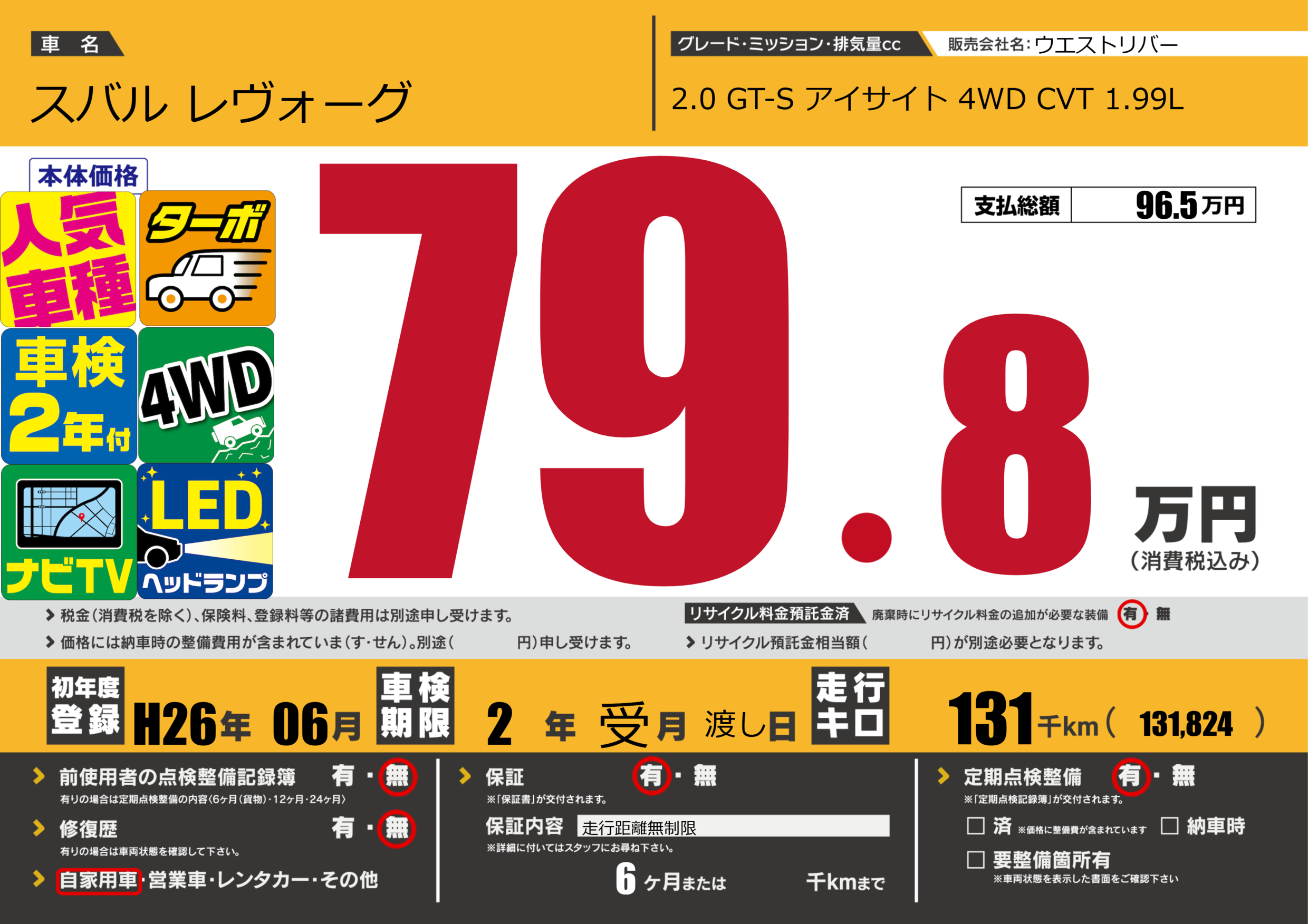 | 車名 | スバル レヴォーグ | グレード ミッション 排気量 |