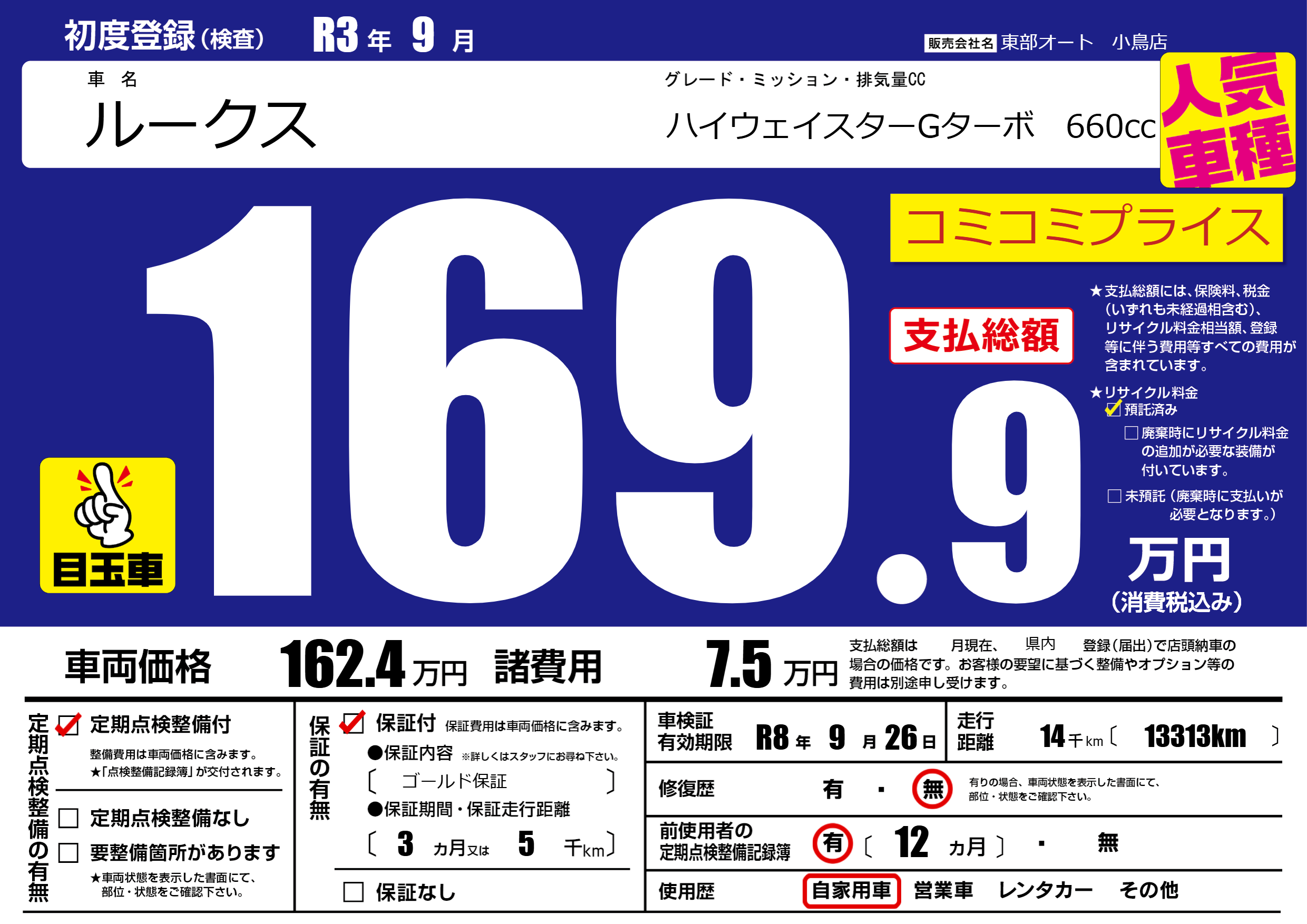 保証付き 保証内容( ゴールド保証) 3ヶ月または5千km |