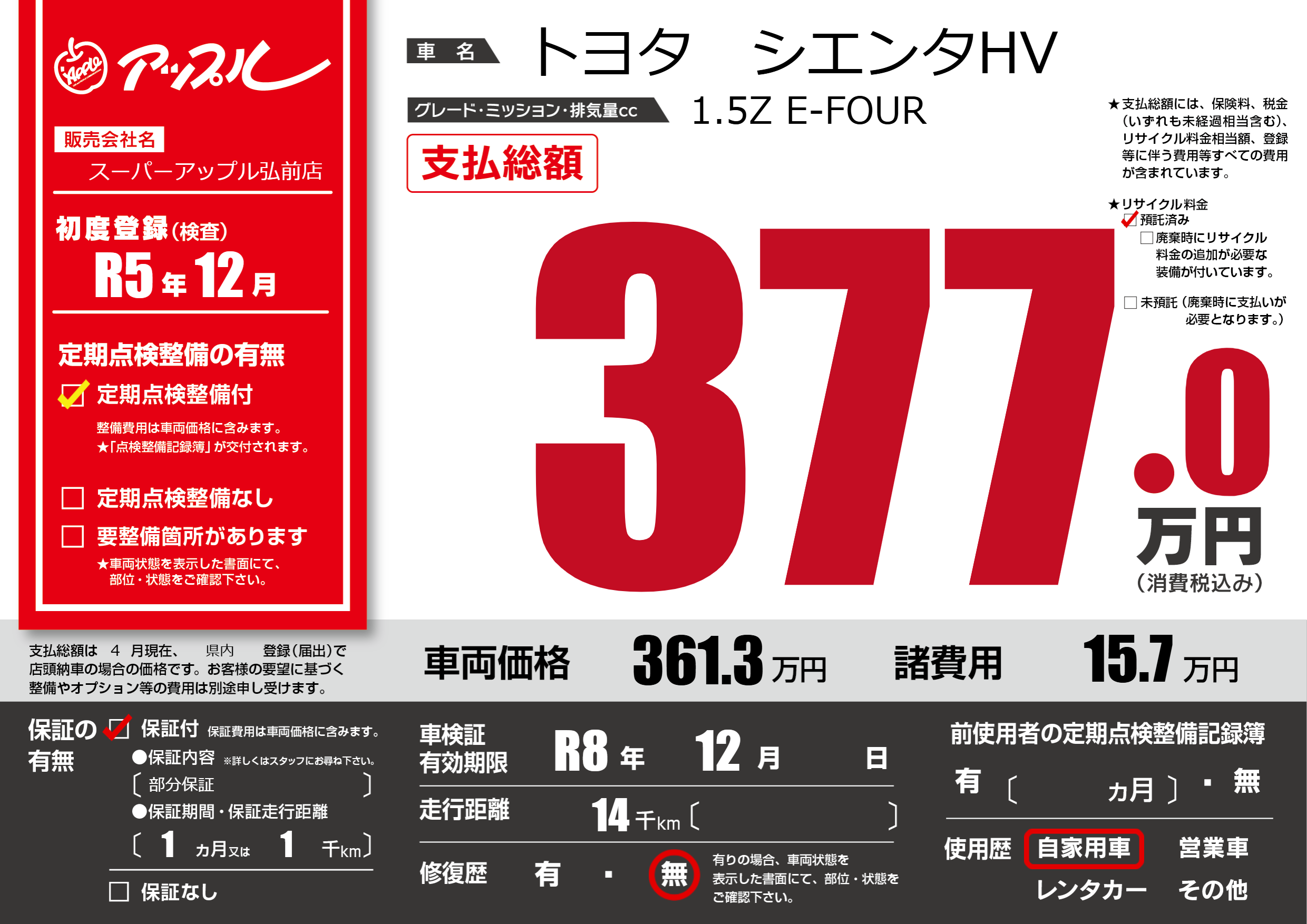 | 車名 | トヨタ シエンタHV | グレード ミッション 排気量 |