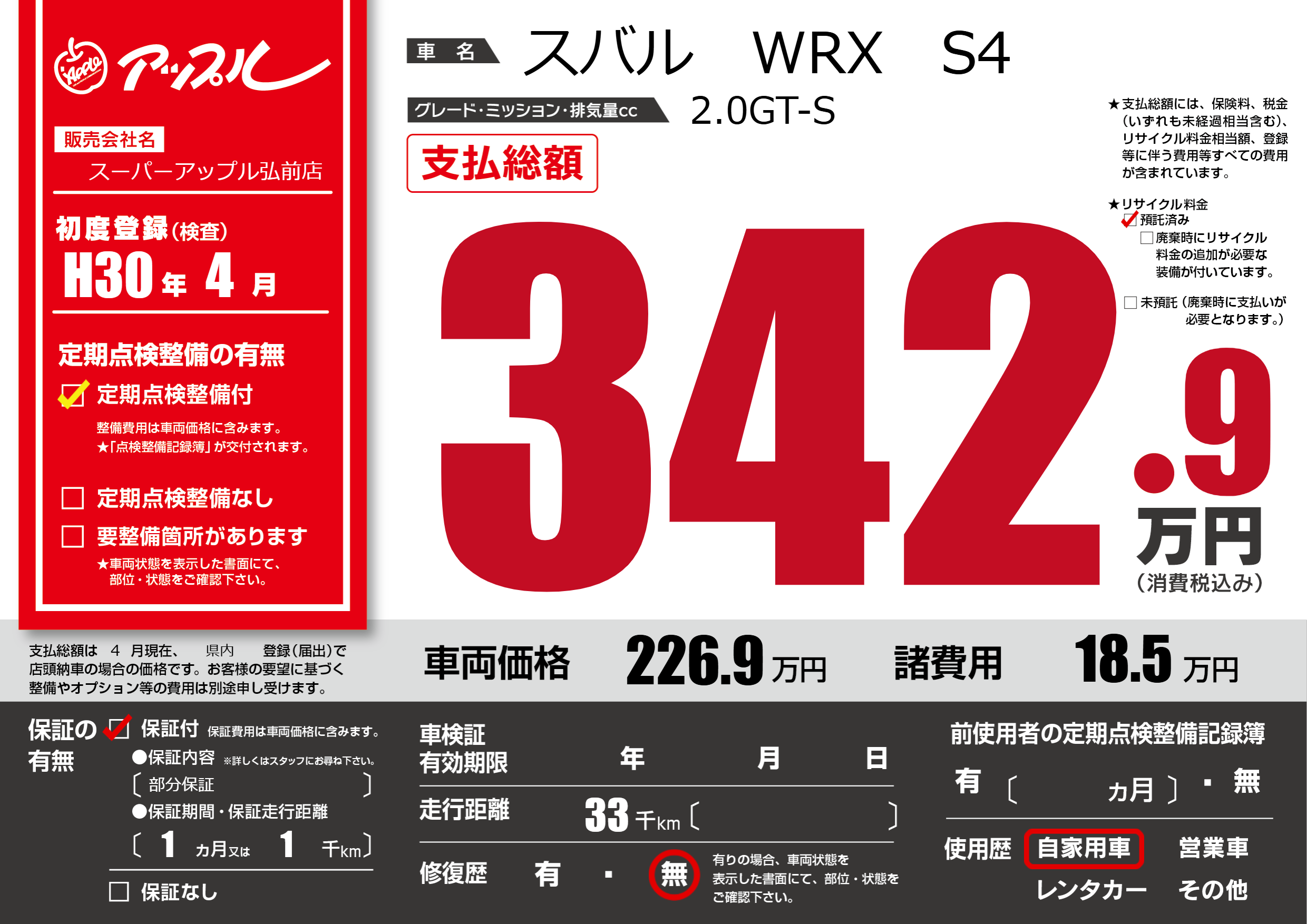 | 車名 | スバル WRX S4 | グレード ミッション 排気量 |