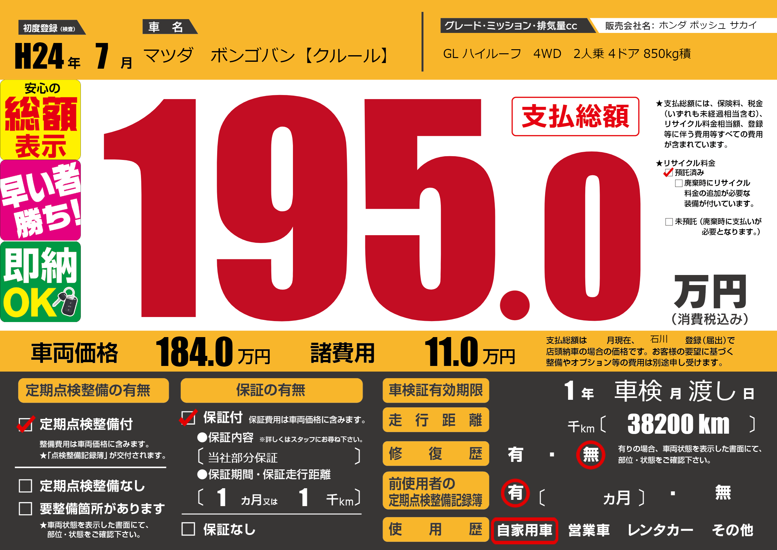 | 車名 | マツダ ボンゴバン【クルール】 | グレード ミッション 排気量 |