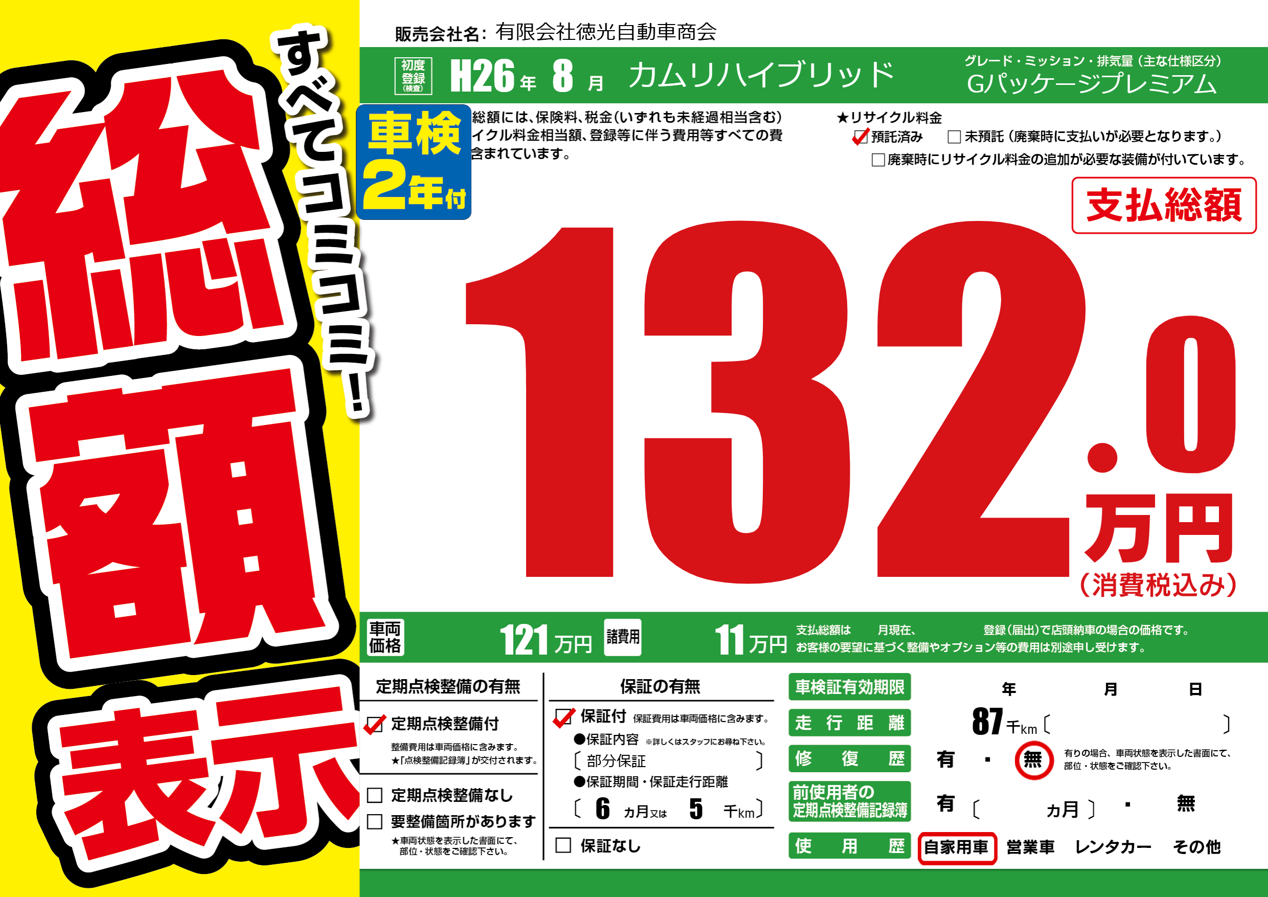 | 走行キロ | 8.7万km | 初年度登録 | H26年8月 |