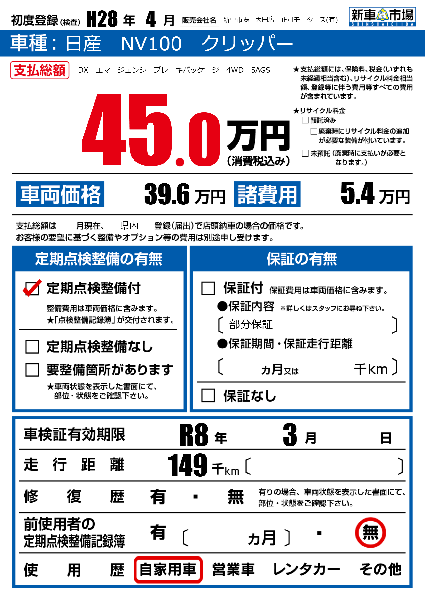 | 走行キロ | 14.9万km | 初年度登録 | H28年4月 |