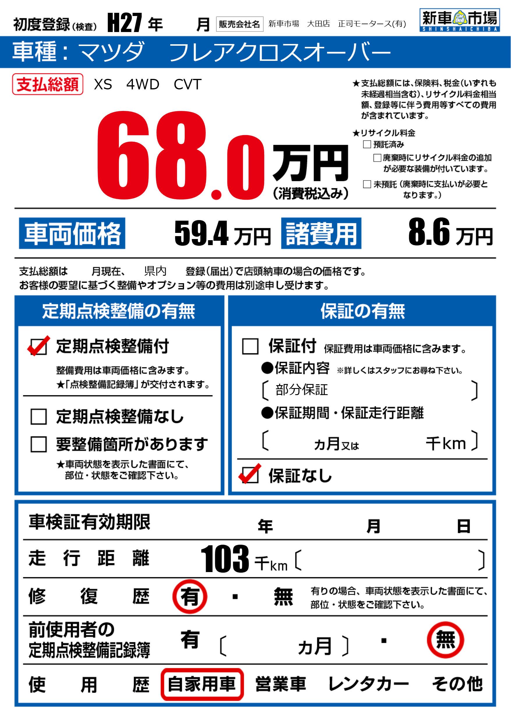 | 車名 | マツダ フレアクロスオーバー | グレード ミッション 排気量 |
