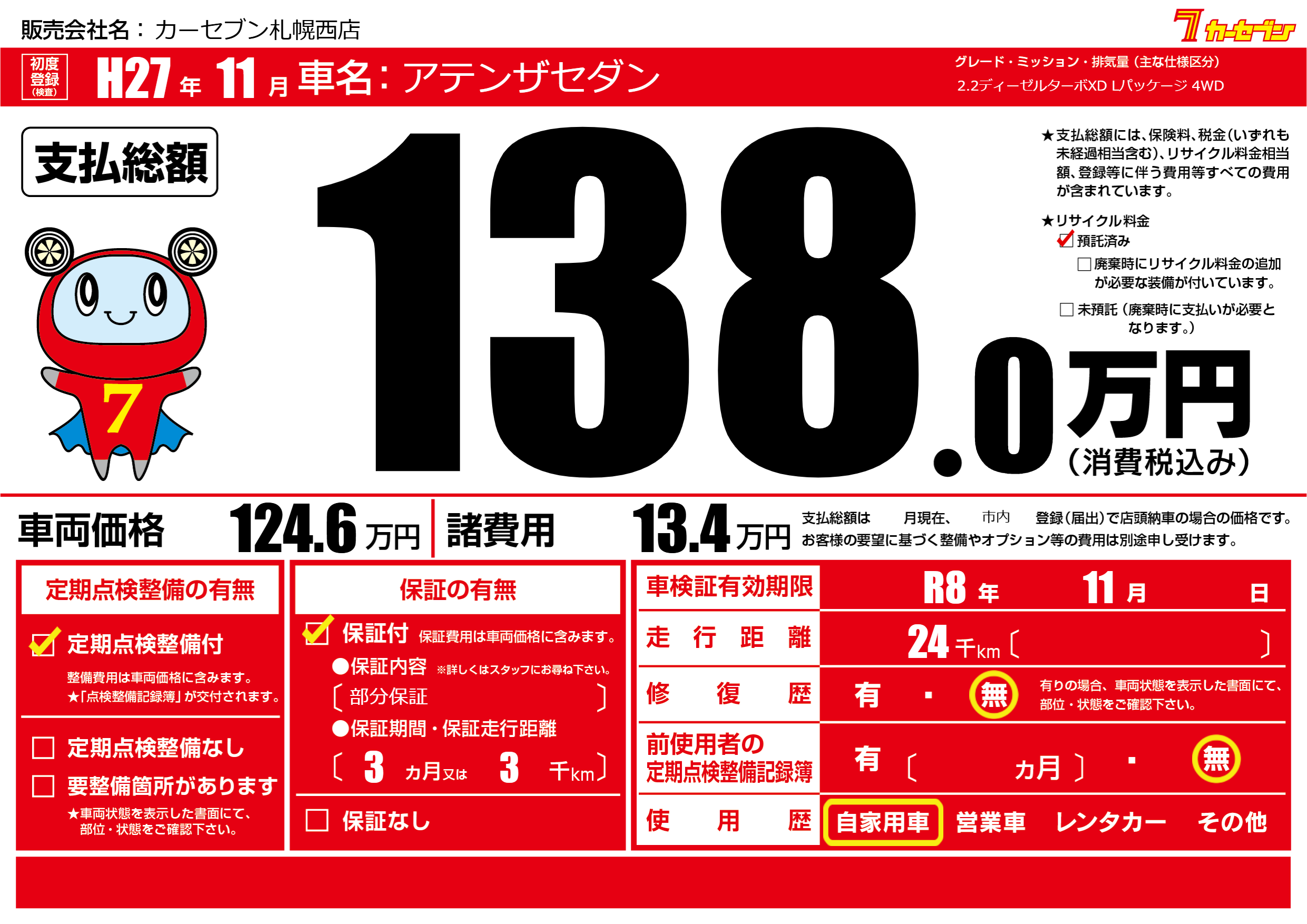 | 車検制限 | R8年 11月 - 日 | ||