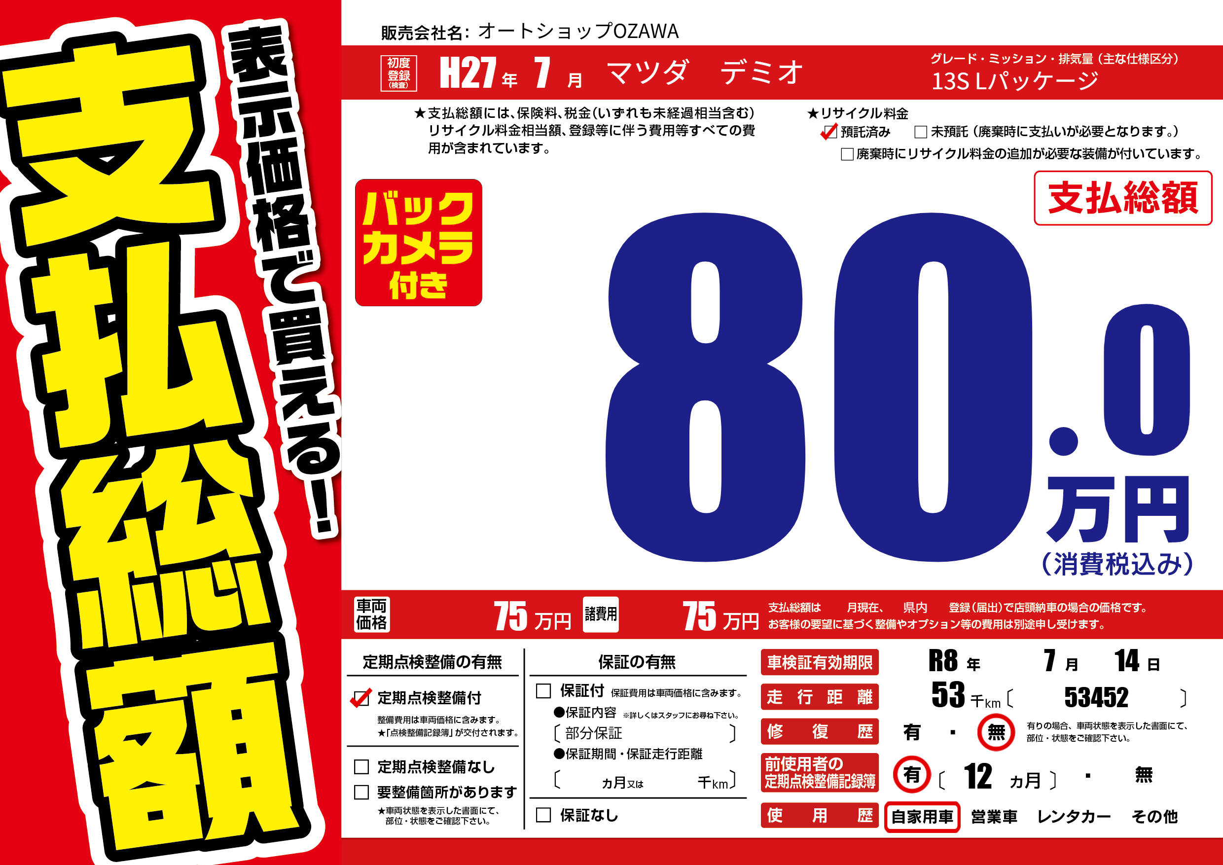 | 車名 | マツダ デミオ | グレード ミッション 排気量 |