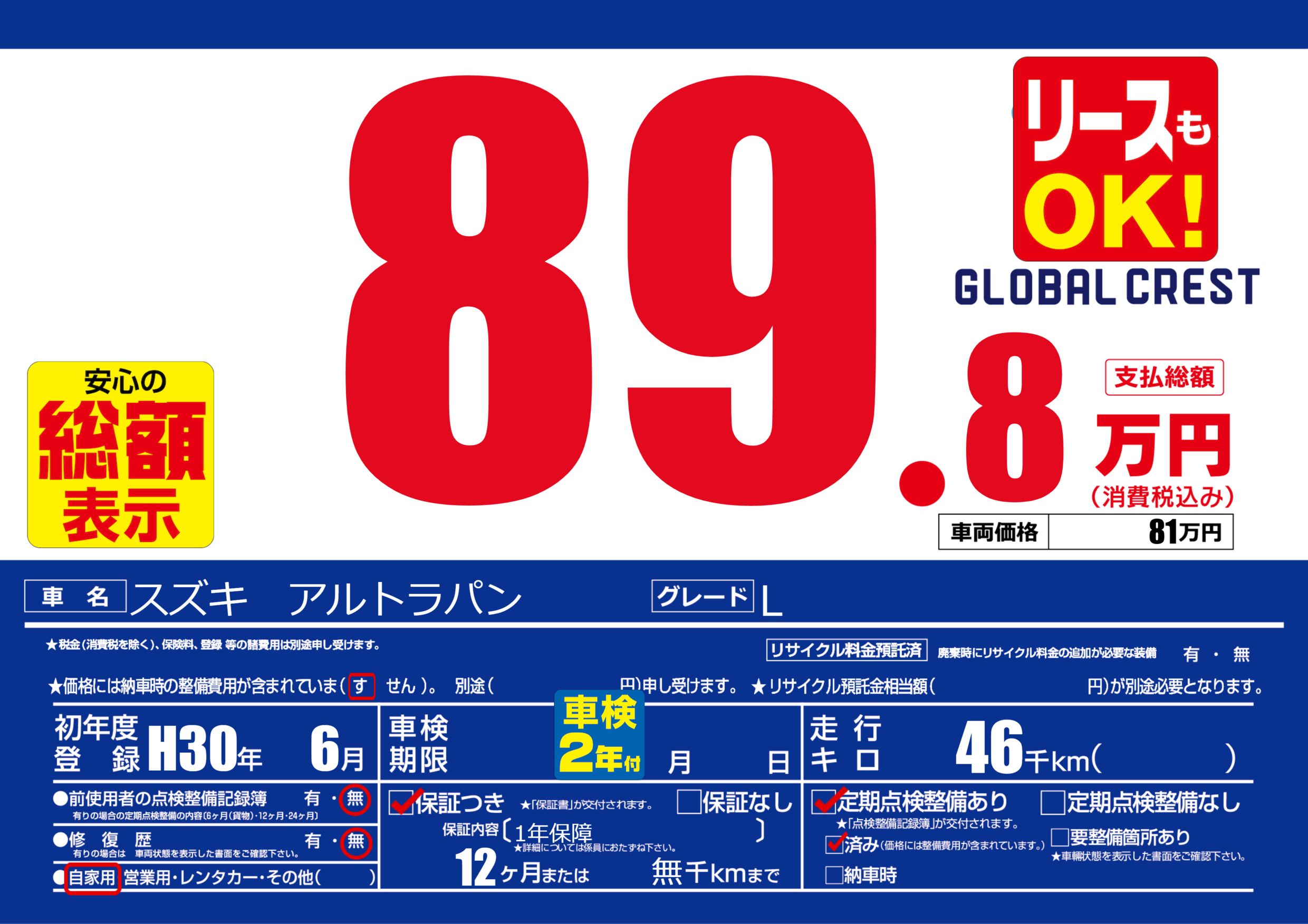 | 定期点検整備 | 定期点検整備あり 定期点検整備済み | ||