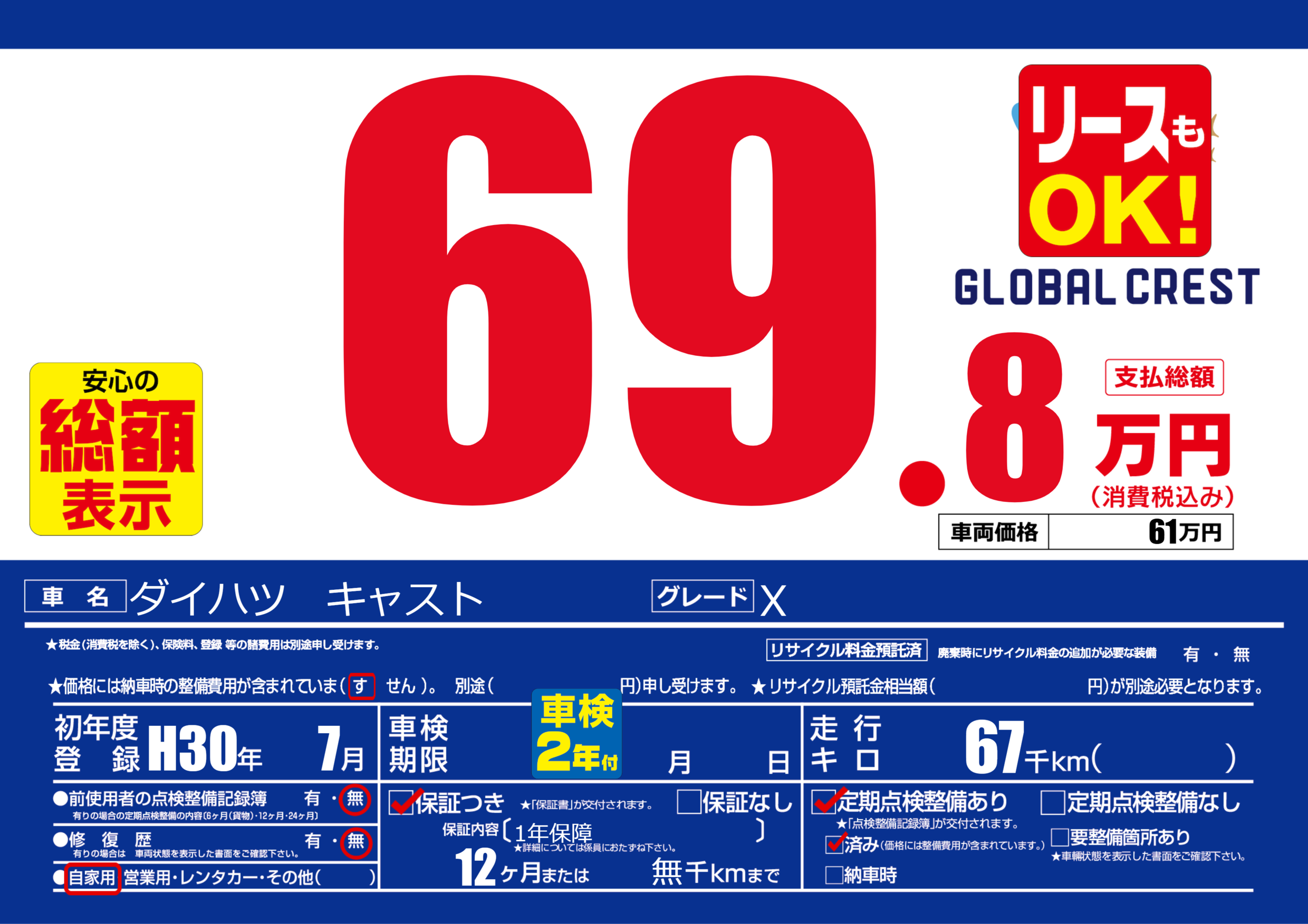 | 定期点検整備 | 定期点検整備あり 定期点検整備済み | ||