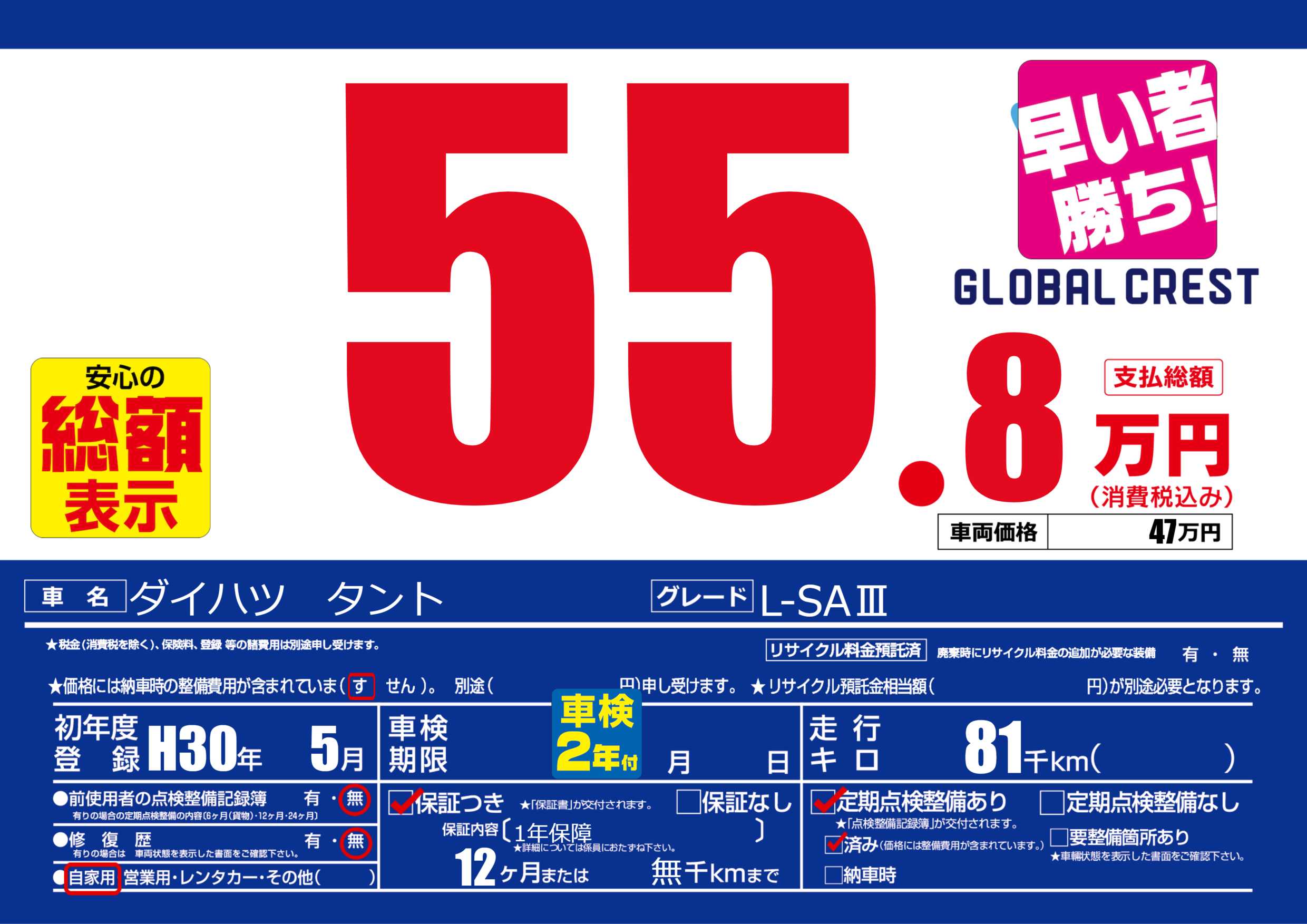 | 車名 | ダイハツ タント | グレード ミッション 排気量 |