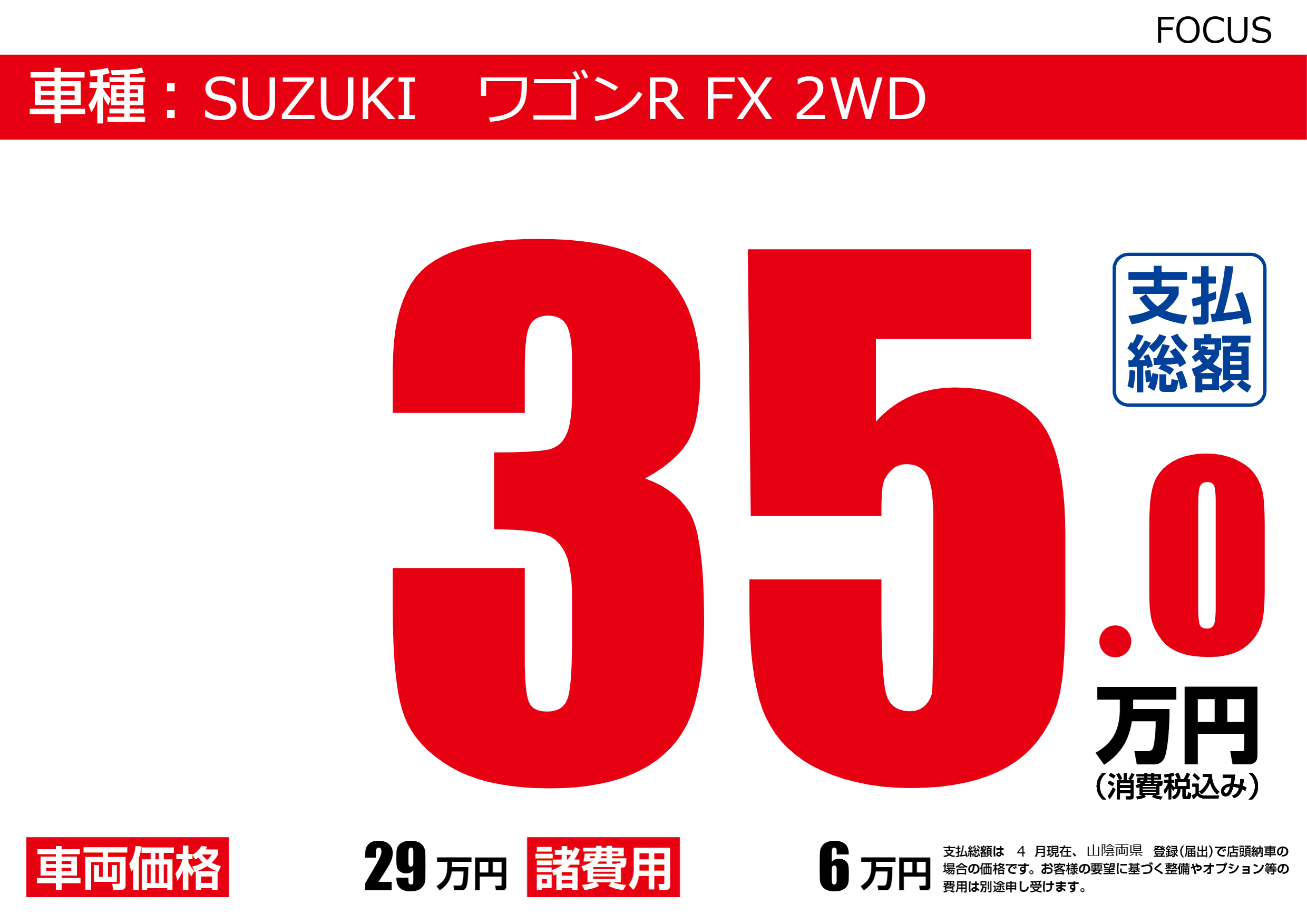 | 車名 | SUZUKI ワゴンR FX 2WD | グレード ミッション 排気量 |