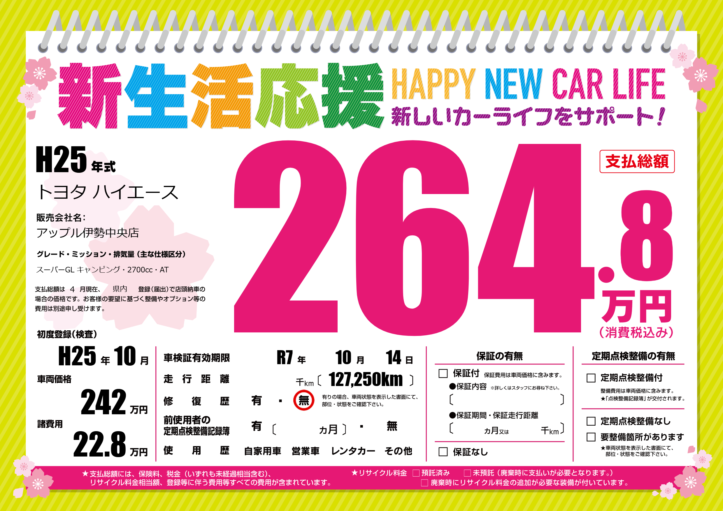 | 車名 | トヨタ ハイエース | グレード ミッション 排気量 |