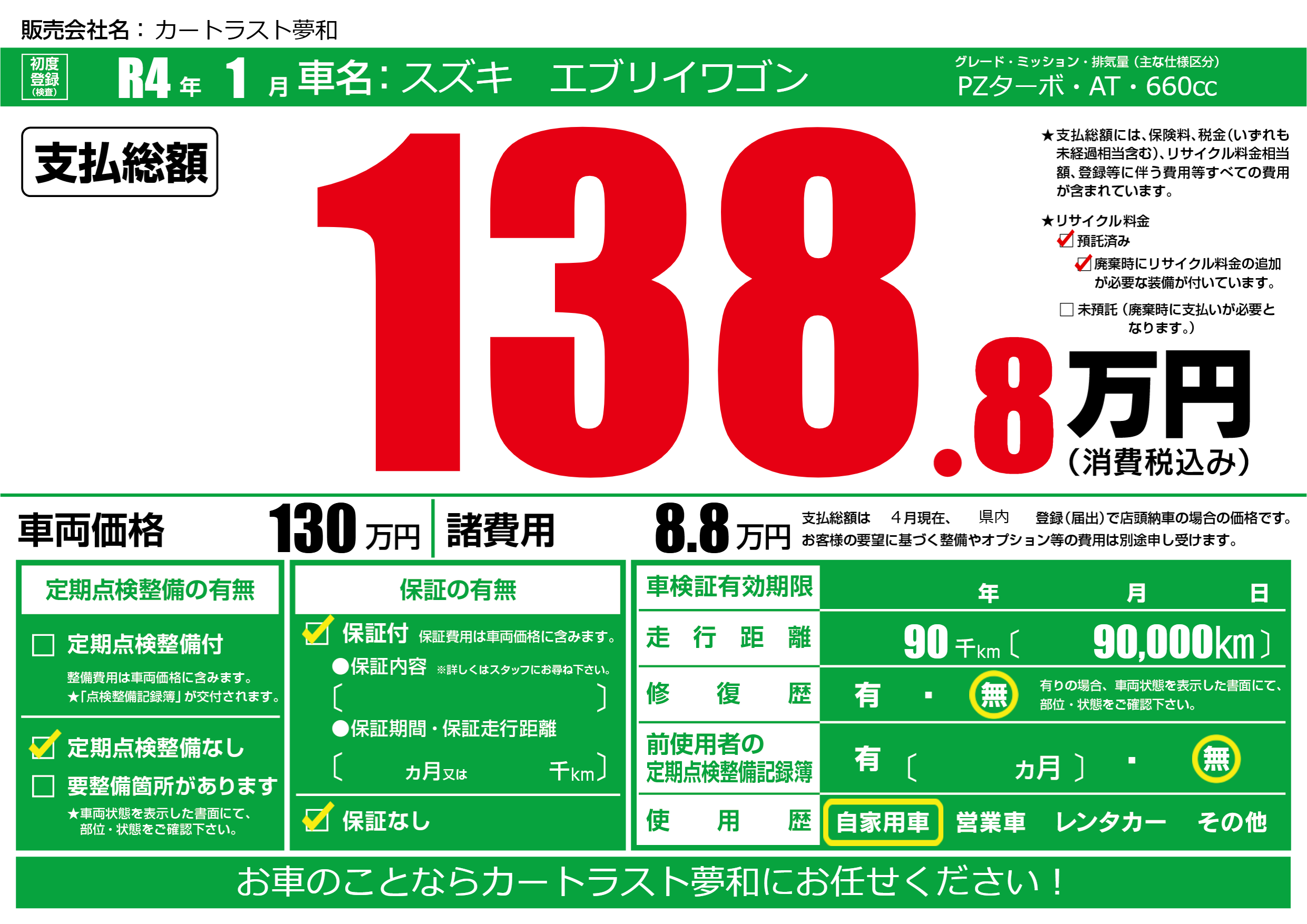 | 走行キロ | 9万km | 初年度登録 | R4年1月 |