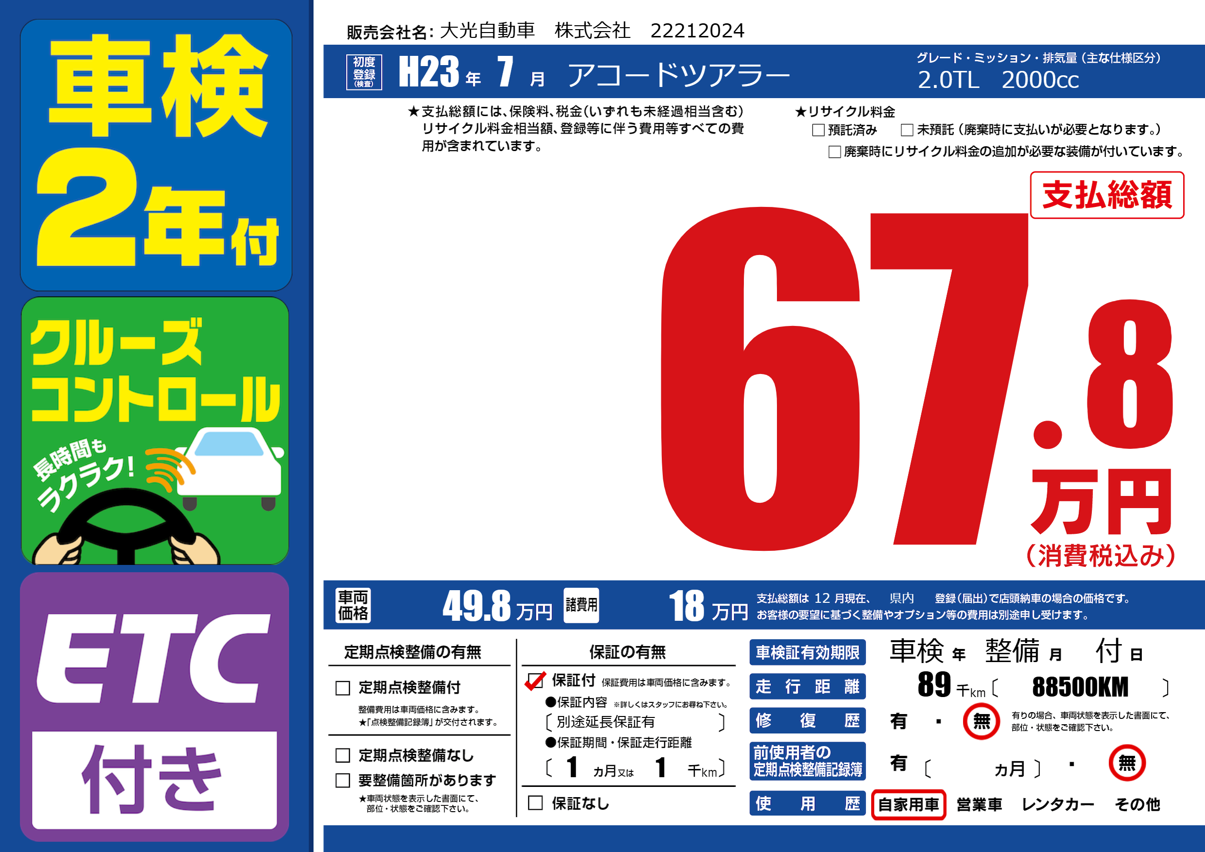 | 走行キロ | 8.9万km | 初年度登録 | H23年7月 |