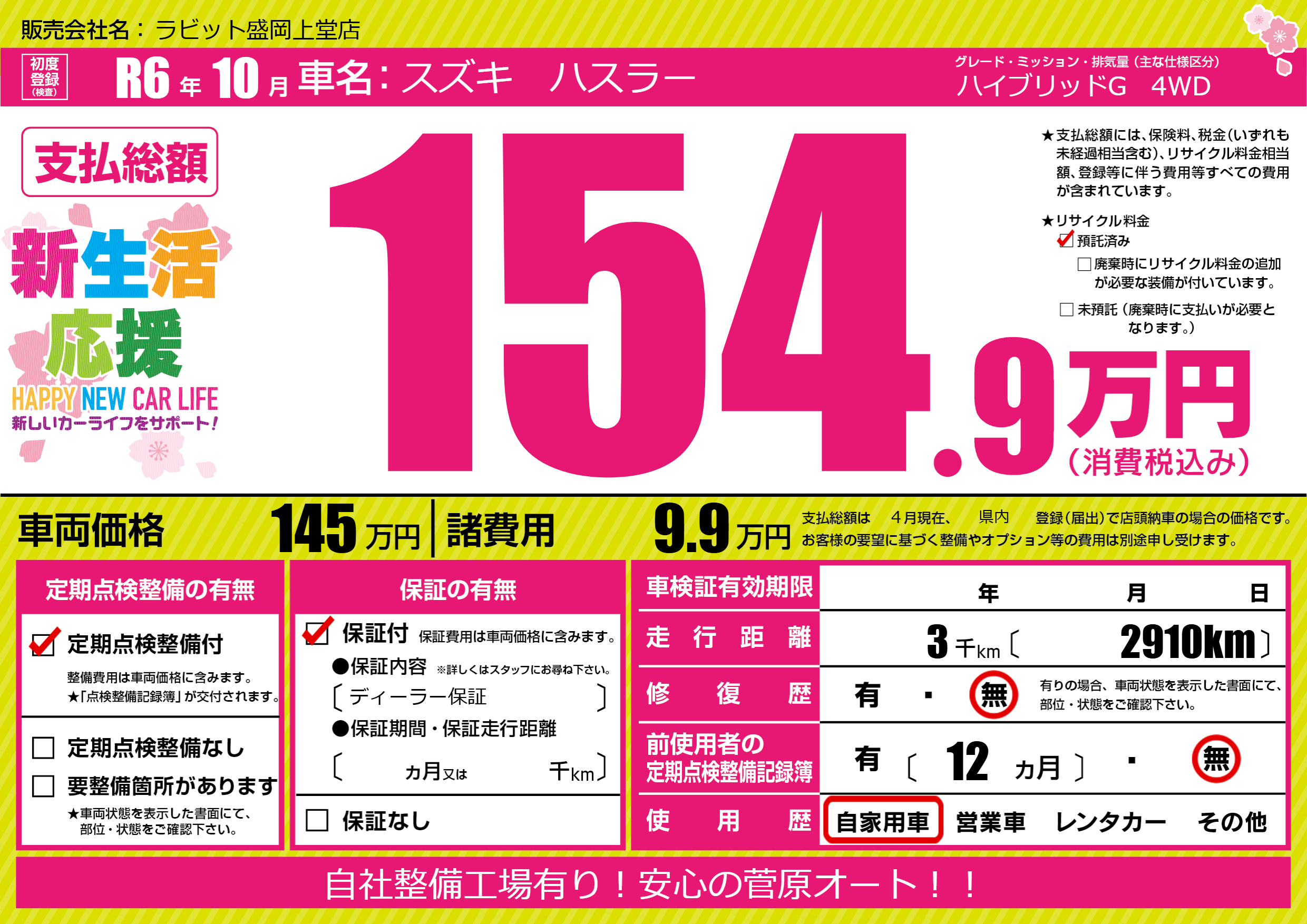 | 走行キロ | 0.3万km | 初年度登録 | R6年10月 |