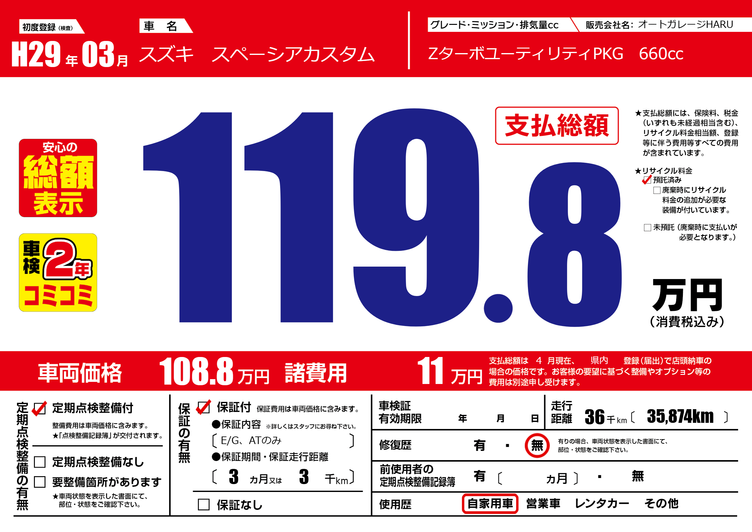 | 車名 | スズキ スペーシアカスタム | グレード ミッション 排気量 |