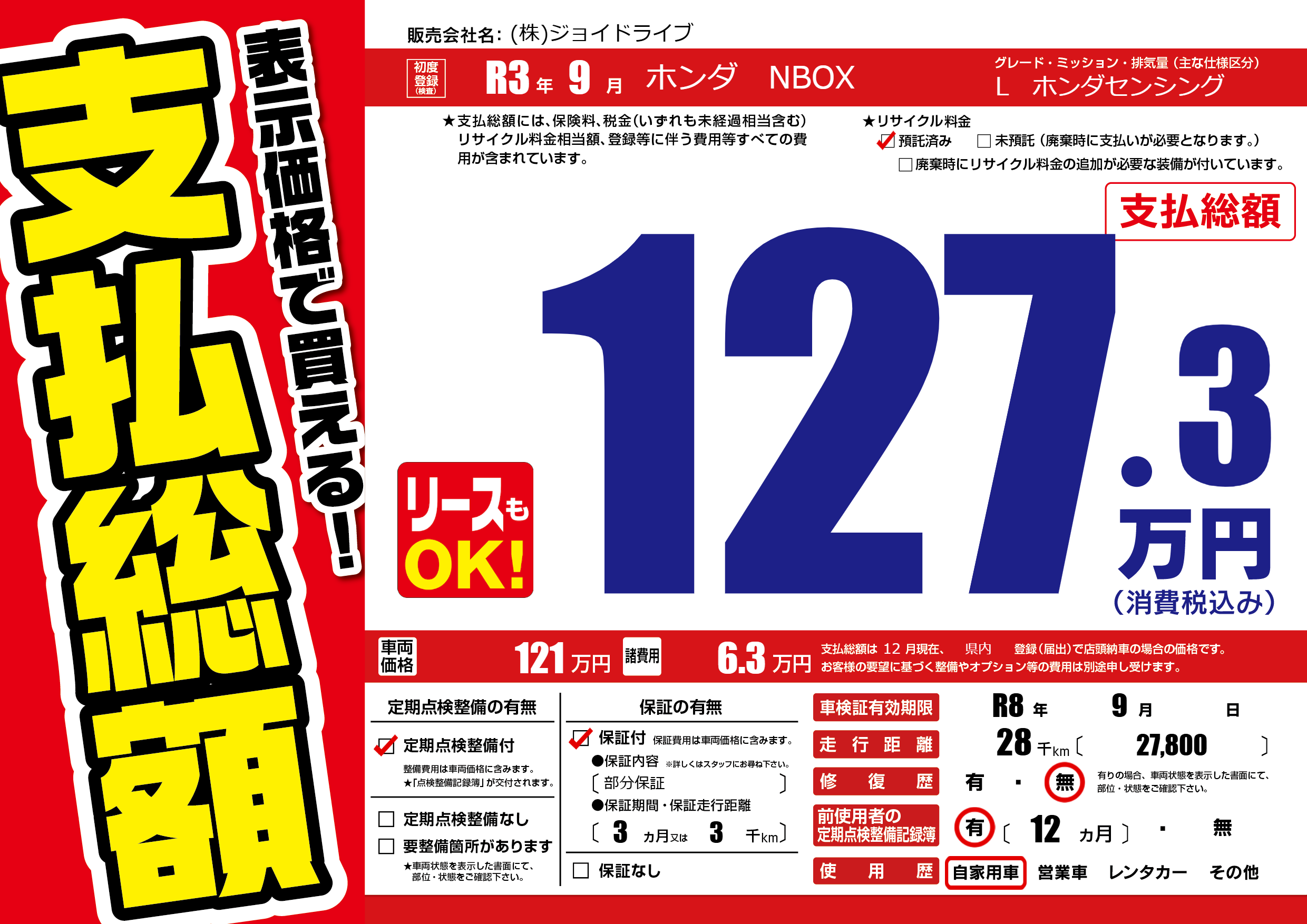 | 走行キロ | 2.8万km | 初年度登録 | R3年9月 |