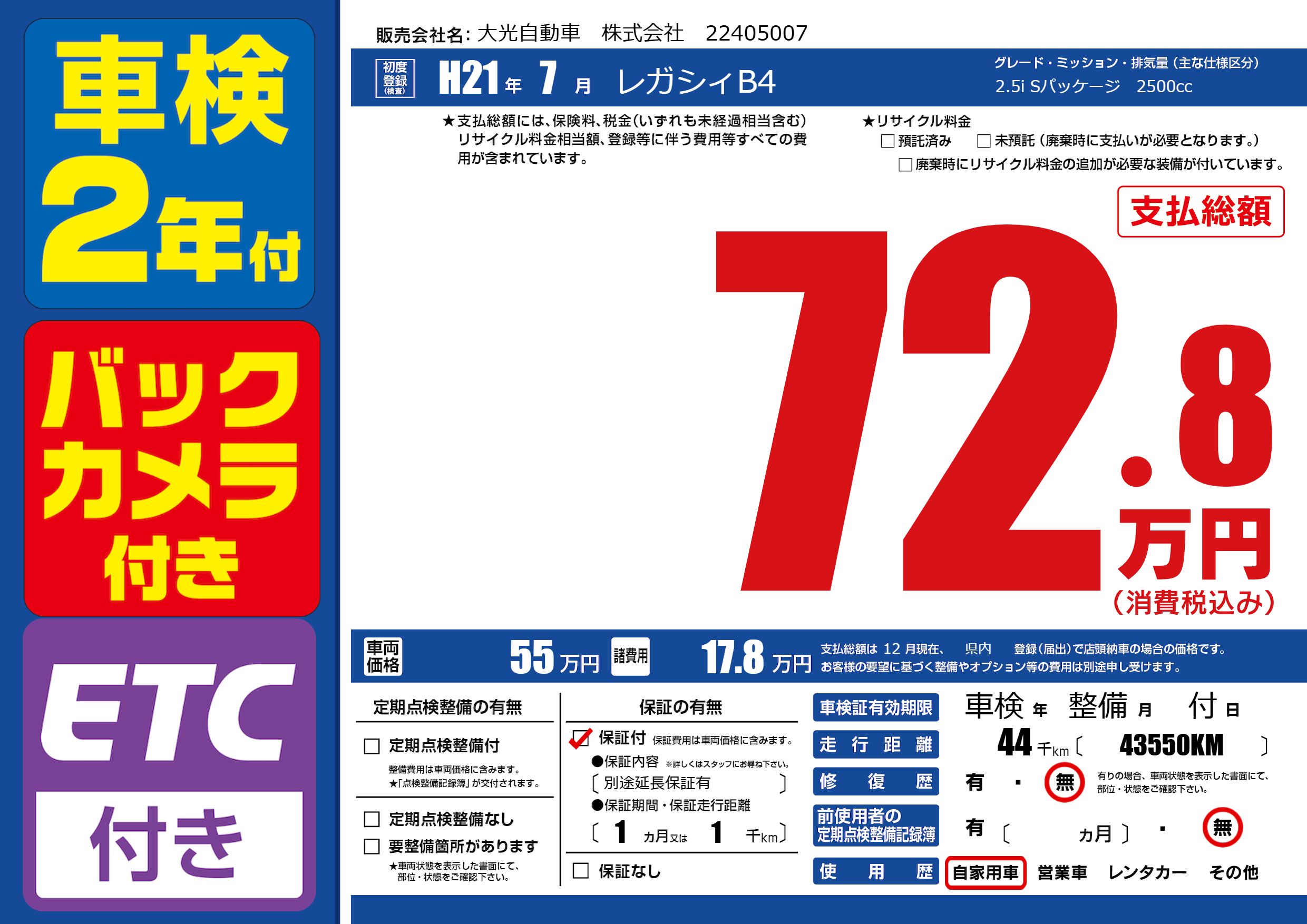 | 車名 | レガシィB4 | グレード ミッション 排気量 |