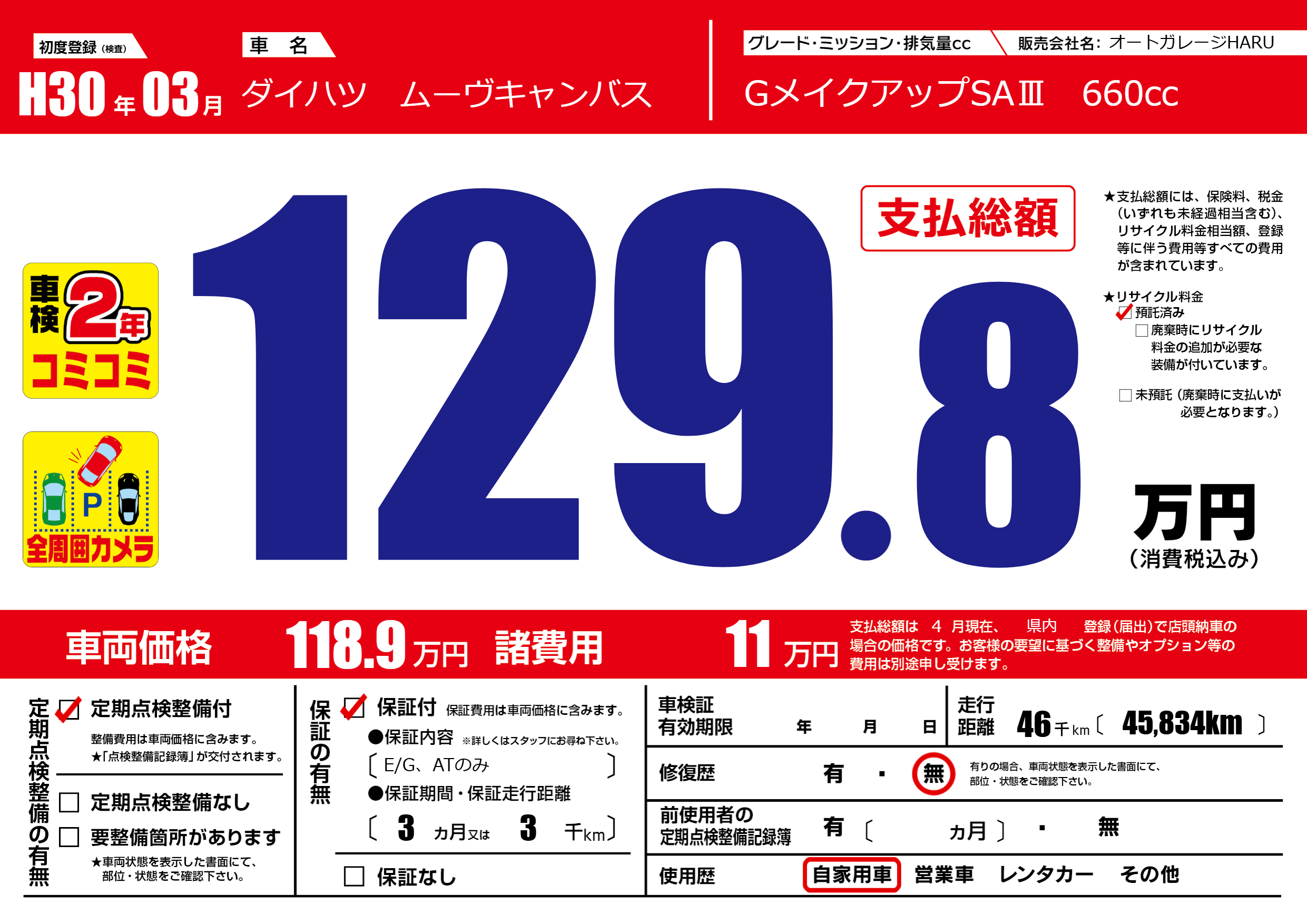 | 走行キロ | 4.6万km | 初年度登録 | H30年03月 |