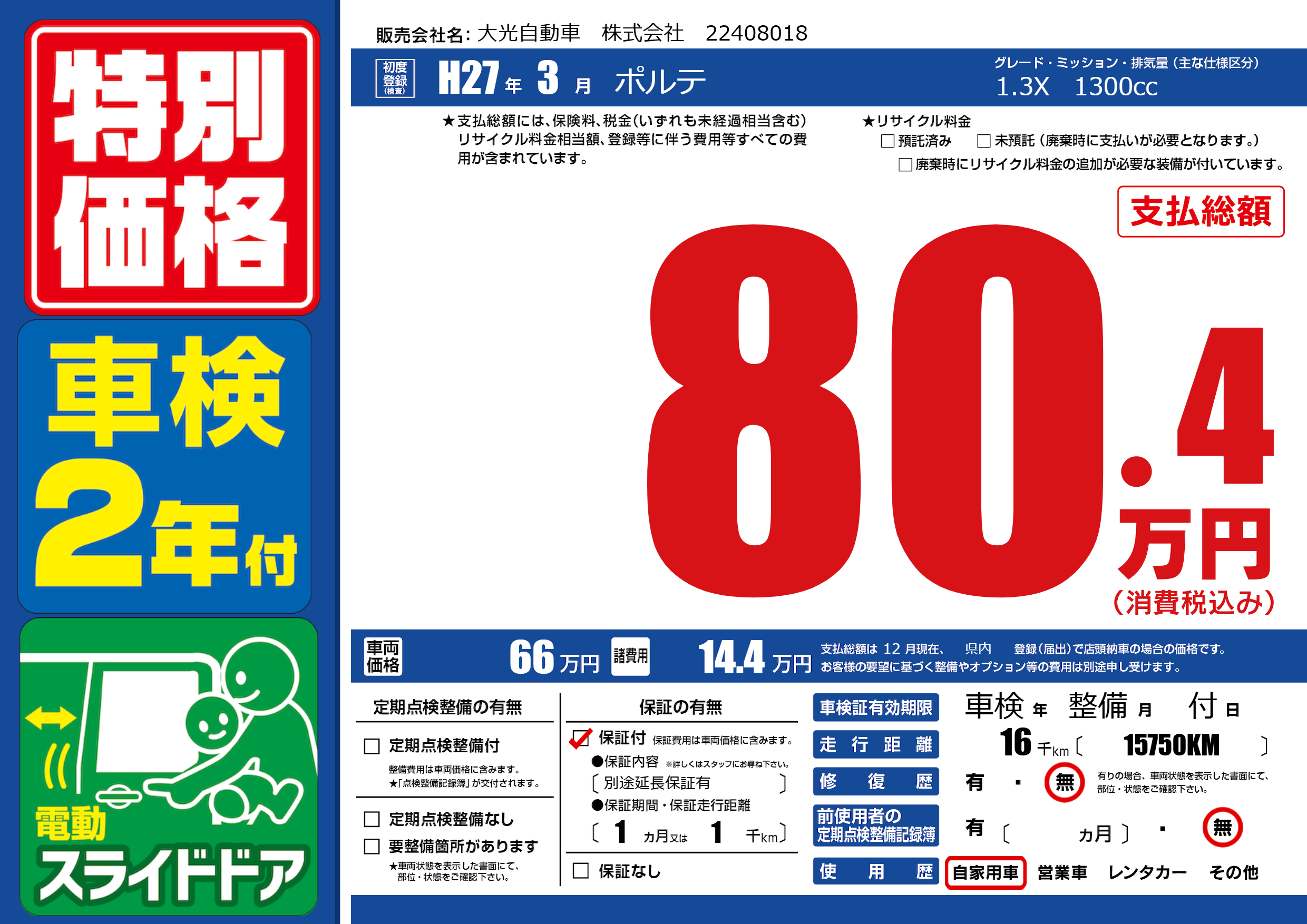 | 車名 | ポルテ | グレード ミッション 排気量 |