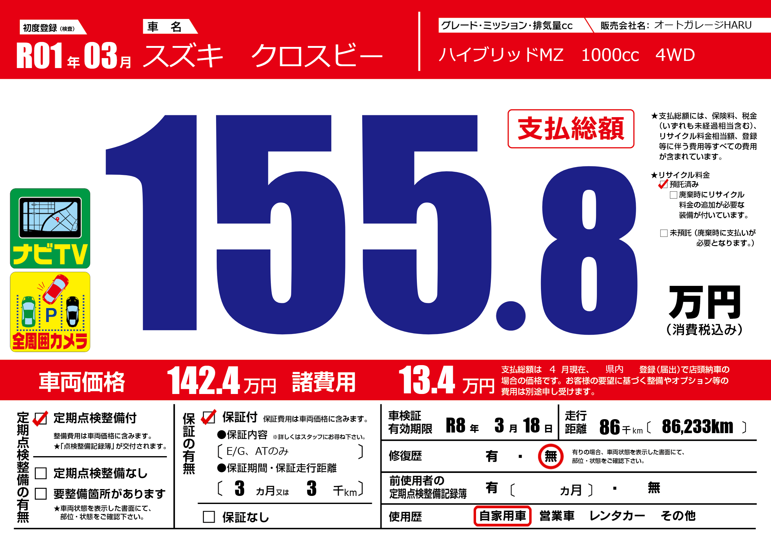 | 走行キロ | 8.6万km | 初年度登録 | R01年03月 |