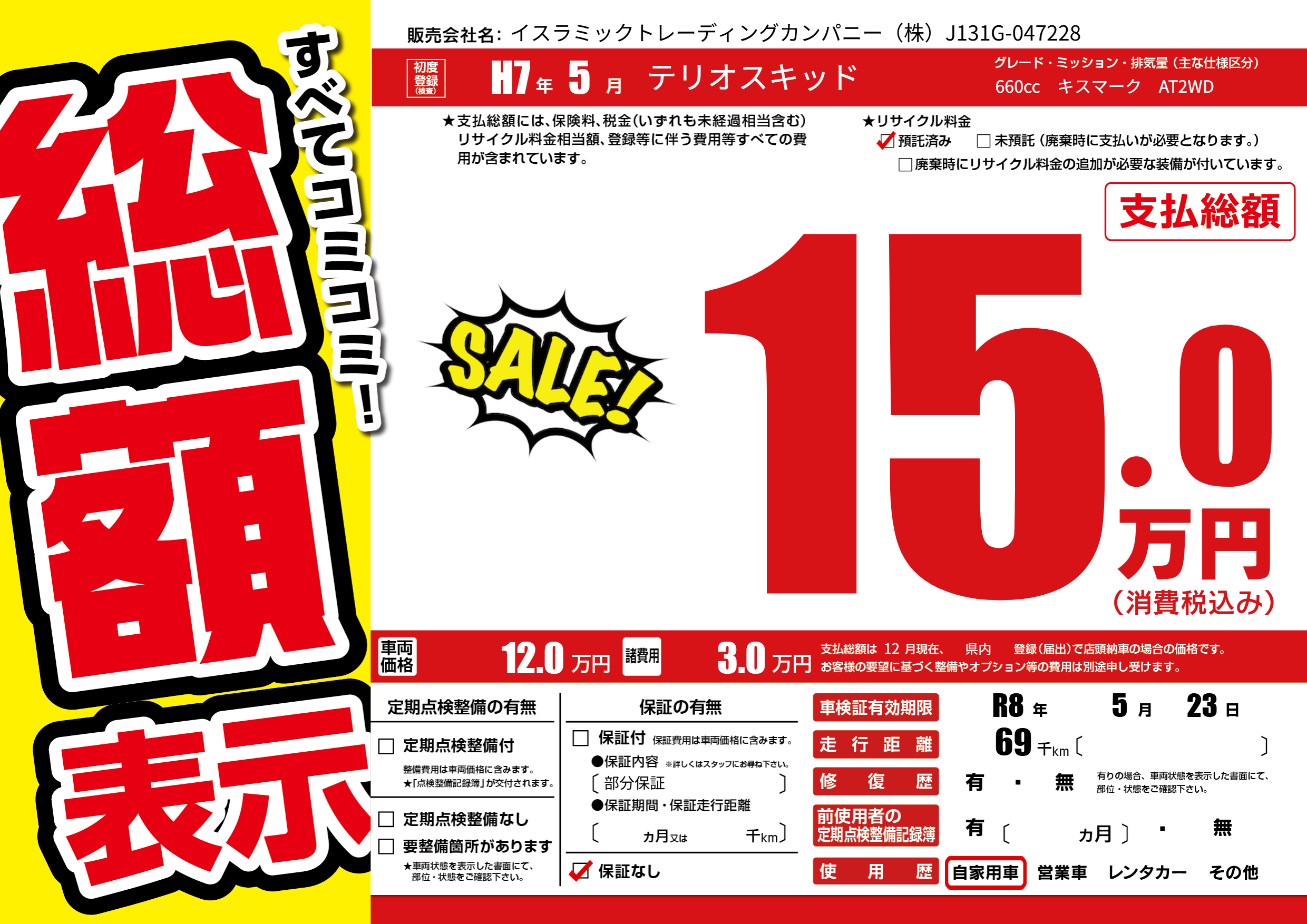 | 走行キロ | 6.9万km | 初年度登録 | H7年5月 |