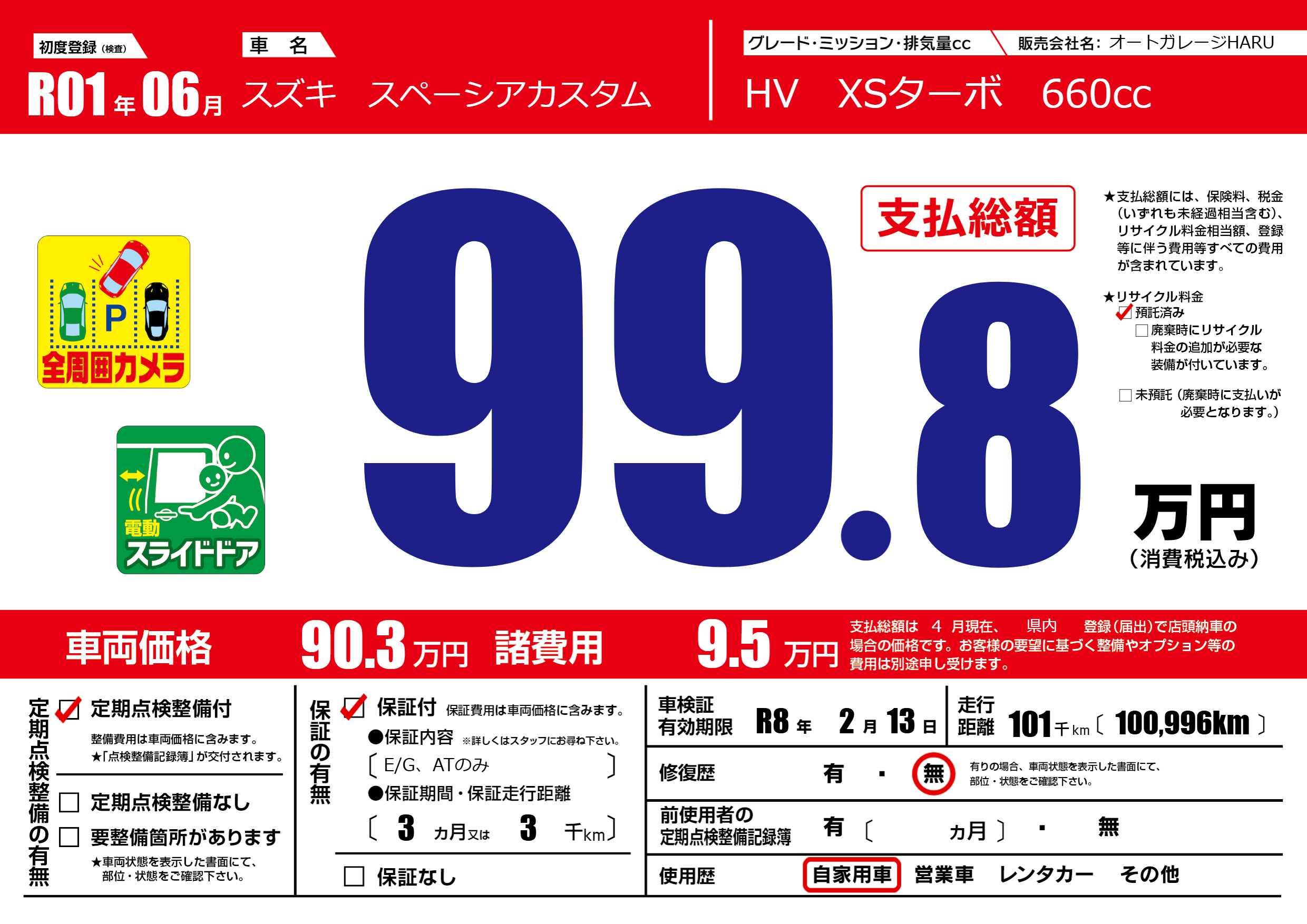 | 車名 | スズキ スペーシアカスタム | グレード ミッション 排気量 |