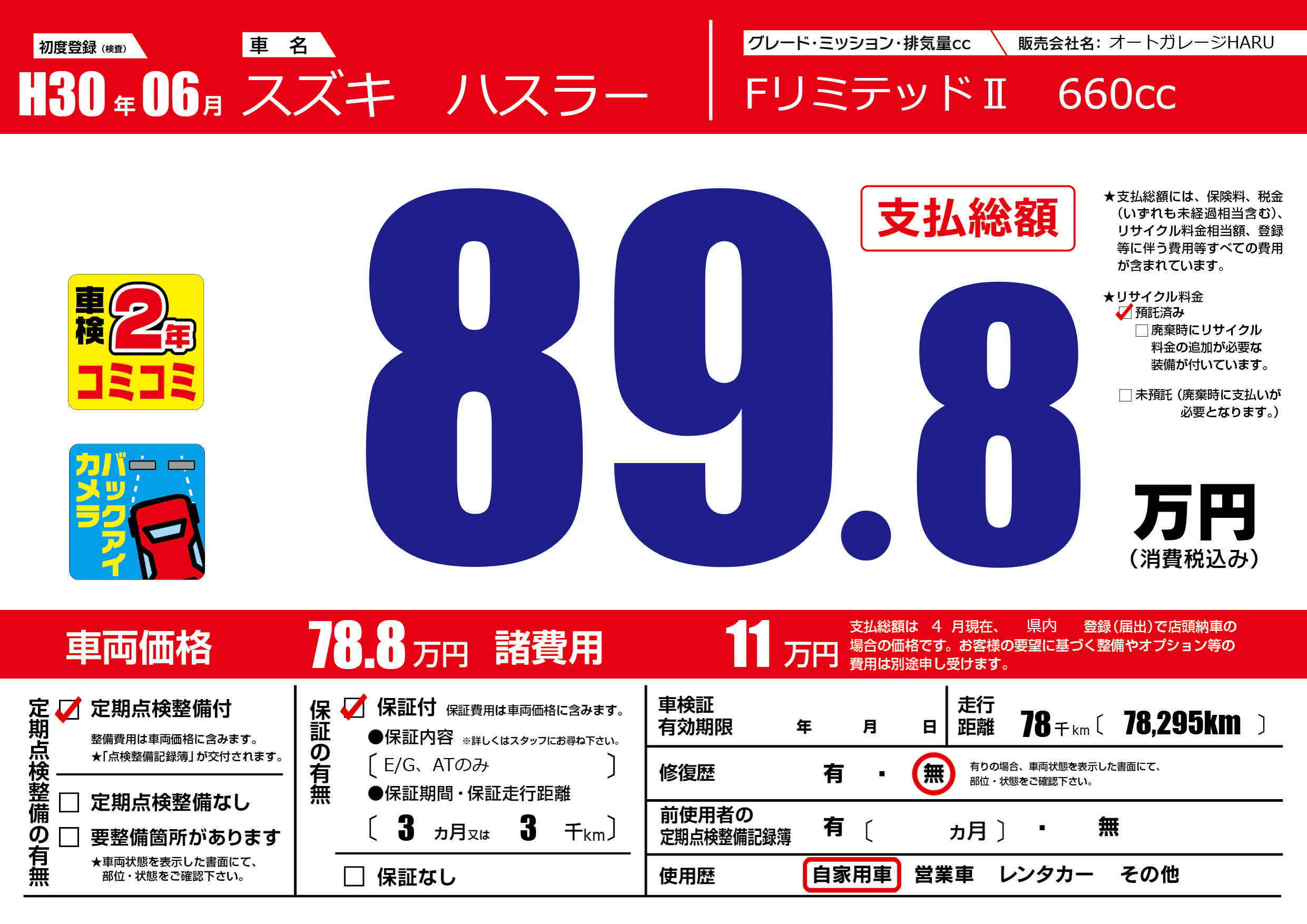 | 走行キロ | 7.8万km | 初年度登録 | H30年06月 |